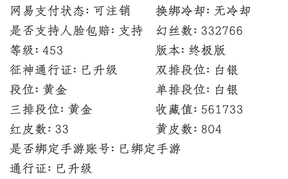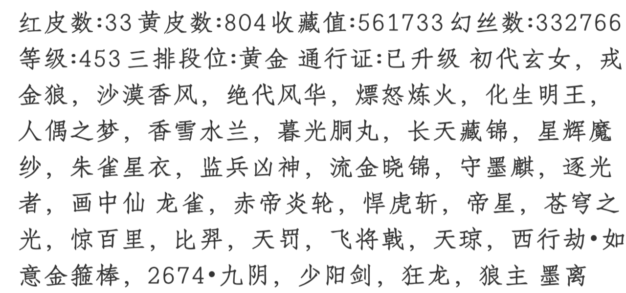 红皮数:33 黄皮数:804 收藏值:561733 幻丝数:332766 等级:453