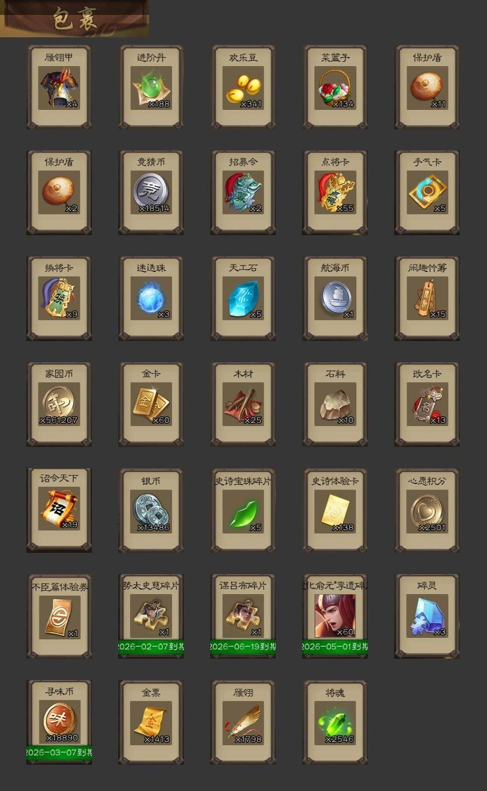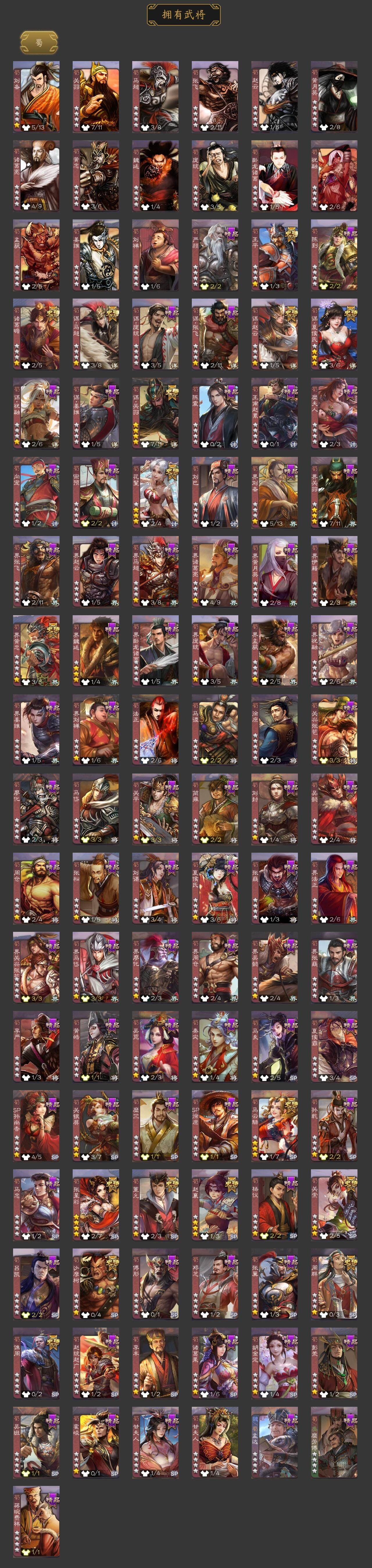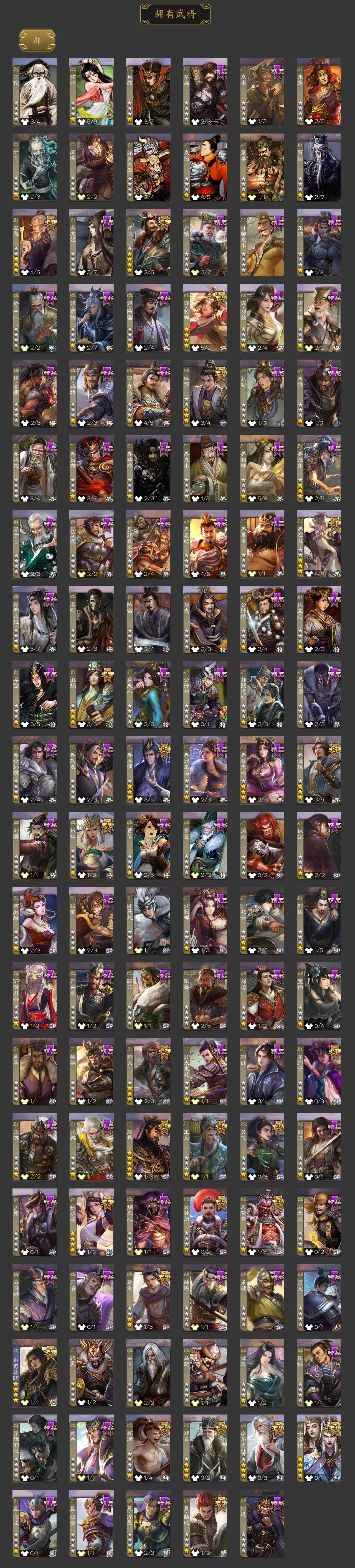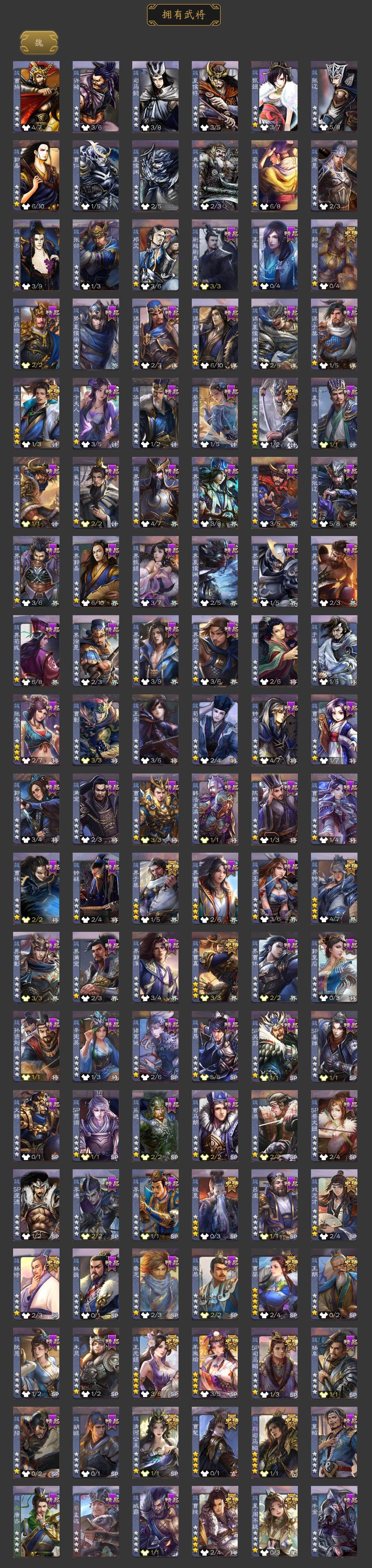 官阶:大将军;VIP等级:VIP13;史诗武将数量:76;动态皮肤数量:77;武将总数:457;史诗宝珠数量:0;将魂数量:2546;神将:9;魏国史诗武将:41;蜀国史诗武将:16;吴国史诗武将:12;群史诗武将:25