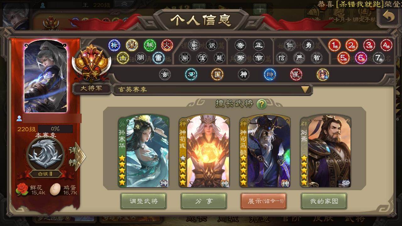 官阶:大将军;VIP等级:VIP13;史诗武将数量:76;动态皮肤数量:77;
