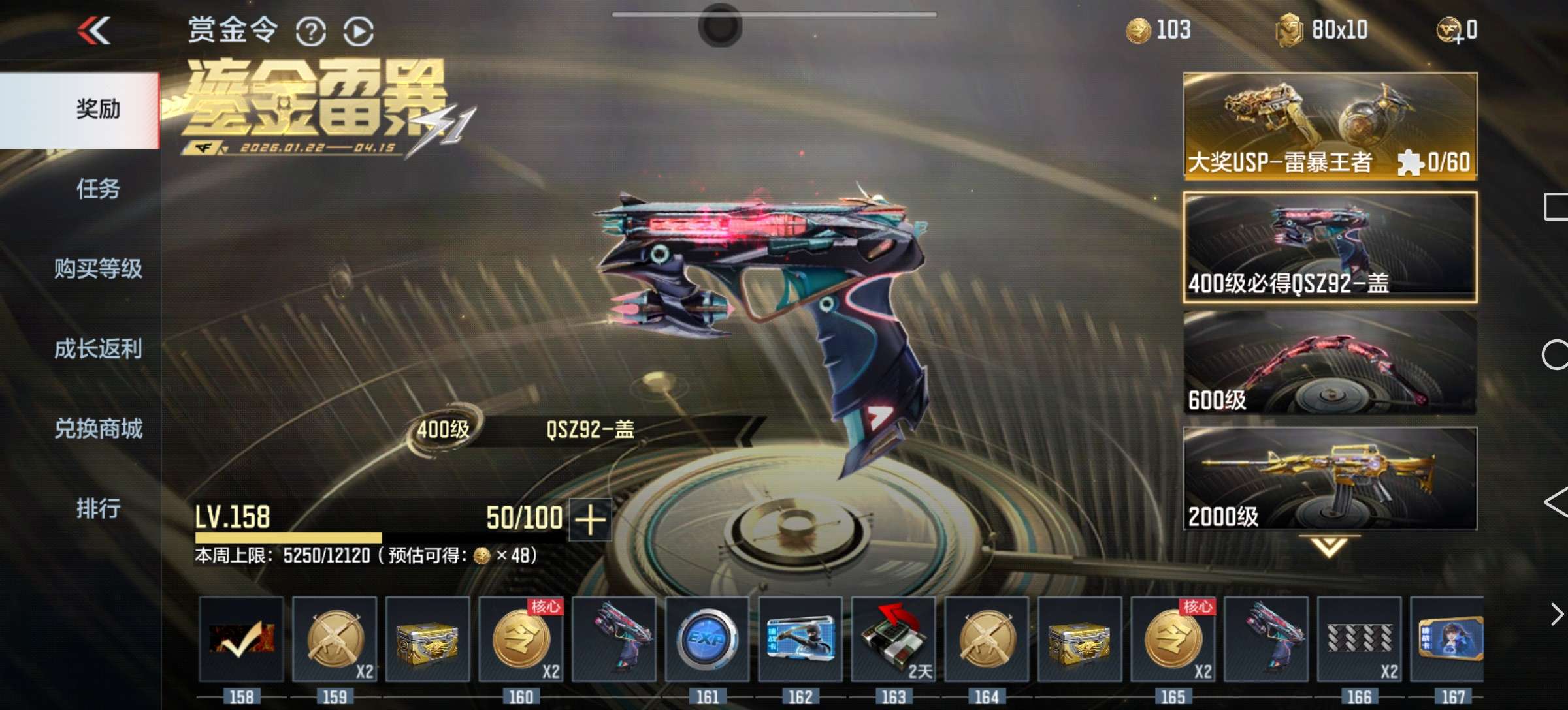 10.3万钻石50把英雄武51钥匙赏金币105个160级大量道具碎片