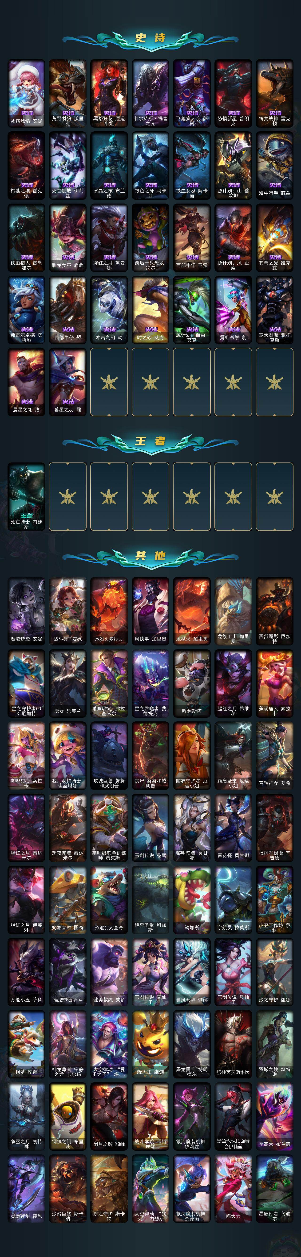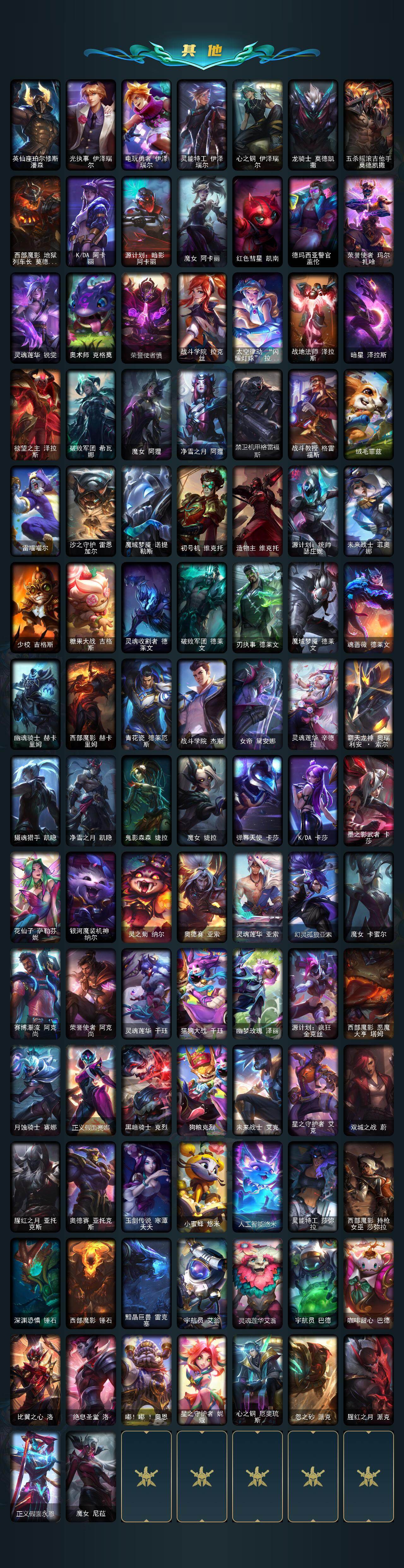 【至臻皮肤】:至臻魔女乐芙兰,至臻灵魂莲华易,至臻剪纸仙灵希维尔,至臻魅惑女巫莫甘娜,至臻KDA阿卡丽,至臻魔女阿卡丽,至臻王国机神玄武盖伦,至臻青花瓷拉克丝,至臻灵魂莲华拉克丝,至
