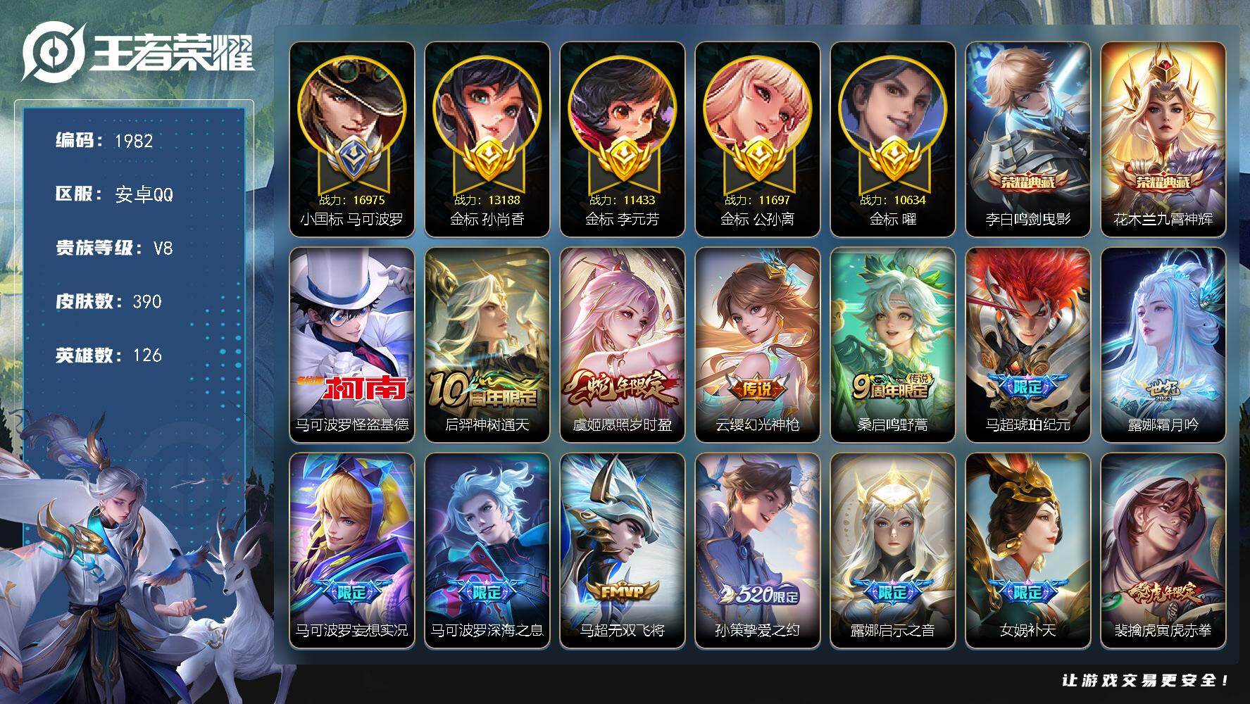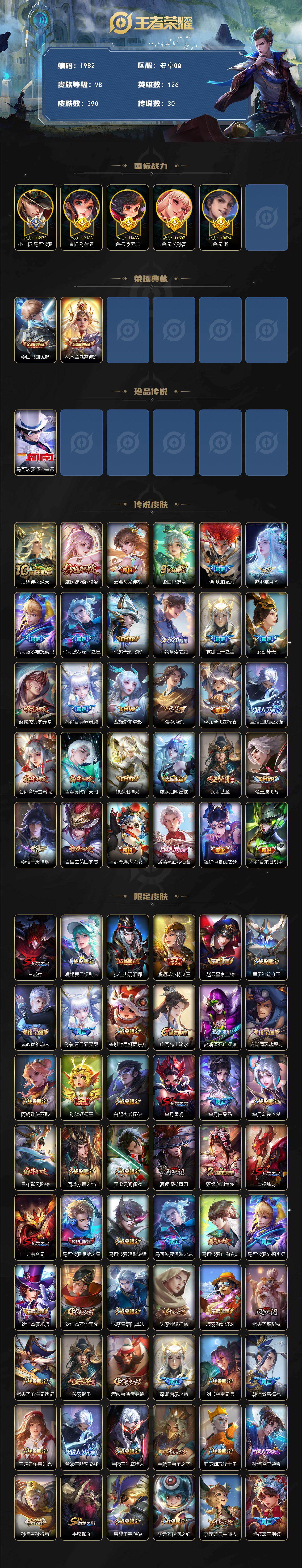 【过年不打烊·小国标马可波罗·1.6万战力·全皮马可波罗·发育路64段3·90皮1珍品30传说·射手号·金标孙尚香,金标曜·金标李元芳·金标公孙离·银标镜·打野43段·9按键】安卓Q-V8-永恒钻石IV段位-126英雄-390皮肤-2典藏皮肤-1珍品传说-30传说-114史诗