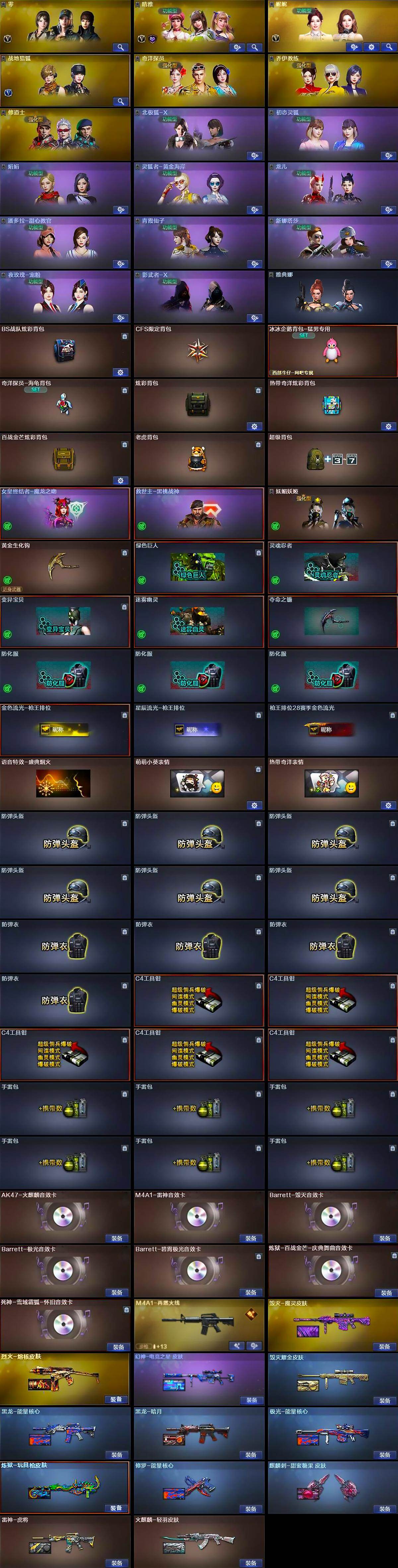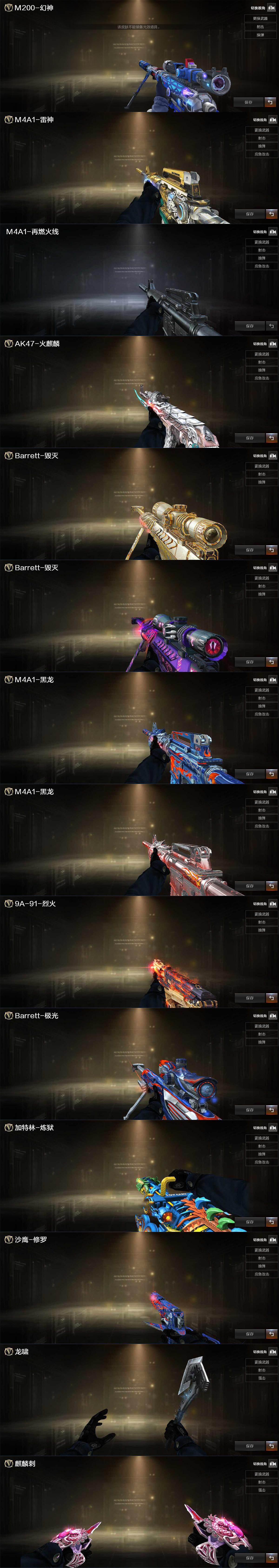【音效卡】:AK47-火麒麟音效卡,M4A1-雷神音效卡,Barrett-毁灭音效卡,Barrett-极光音效卡,Barrett-碧霄极光音