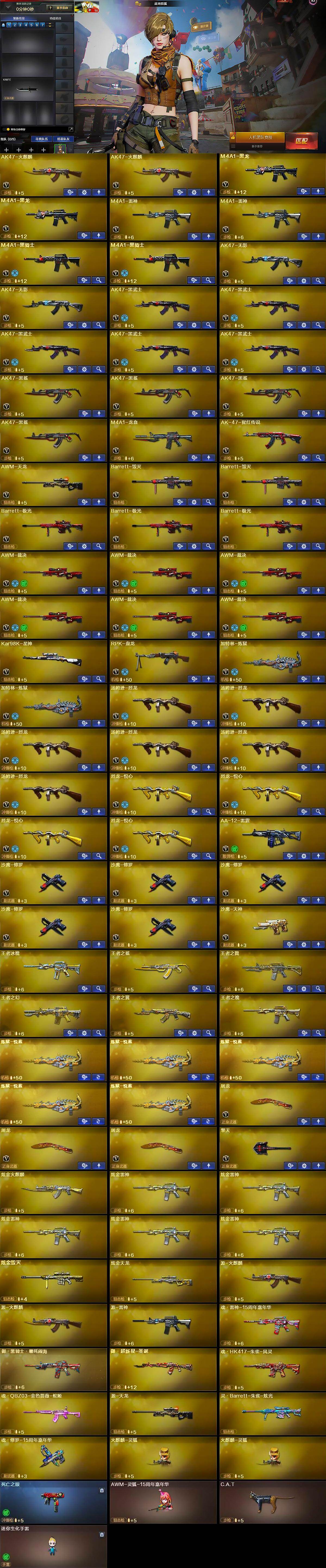 【热门武器】:死亡之眼,Kar98K-星神,金色小号,C.A.T,M4A1-黑骑士*2,汤姆逊-烈龙*6,RPK-盘龙,加特林-炼狱*2,沙鹰-修罗*5
