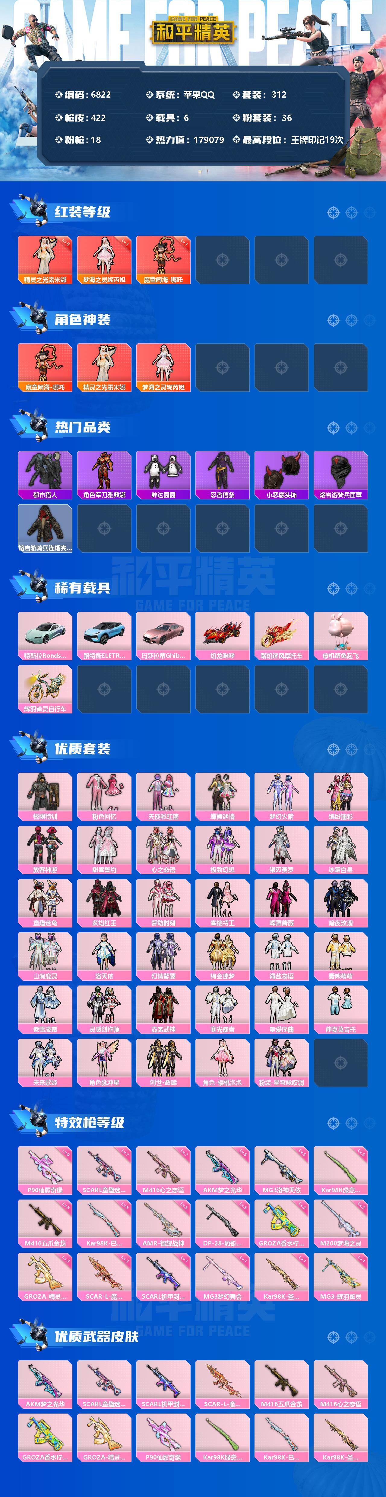 【6822】36粉装-18特效枪-6载具-179079热力值-19印记-312套装-422枪皮【红色神装等级】:一级魔童闹海-哪吒,五级精灵之光-露米娜,一级梦海之灵-妮芮妲【红色角色神装】:魔童闹海-哪吒,精灵之光-露米娜,梦海之灵-妮芮妲【热门品类】:都市猎人【粉色套装】:梦幻火箭【粉色枪皮等级】:九级P90-仙履奇缘