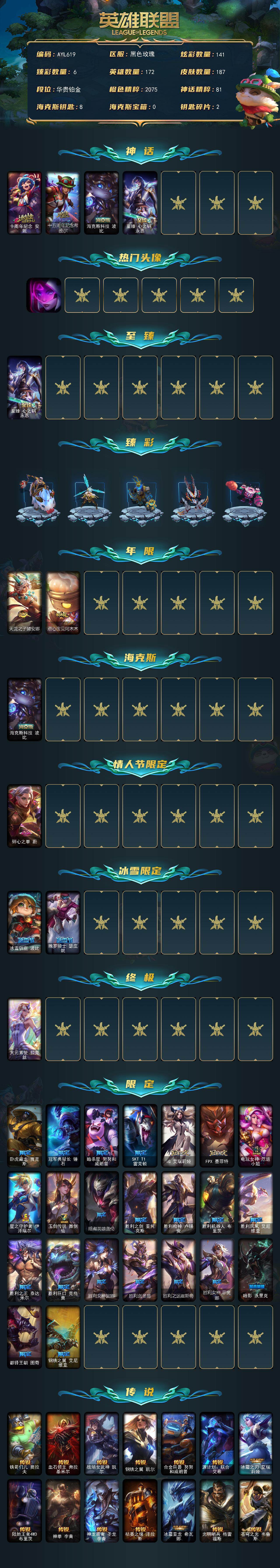 【店主推荐捡漏号】铂金段位-172英雄-187皮肤-141炫彩-1终极-4神话-29限定-16传说-43史诗