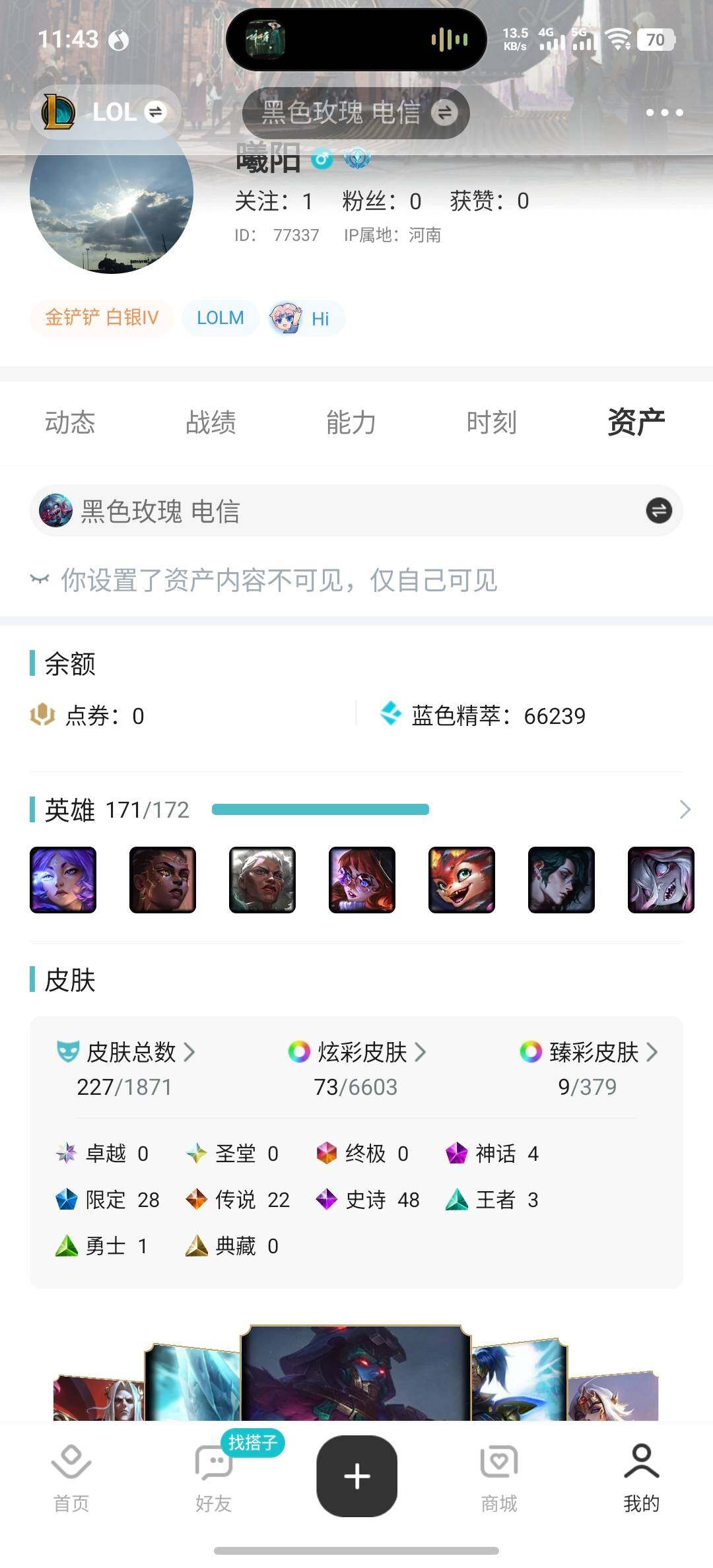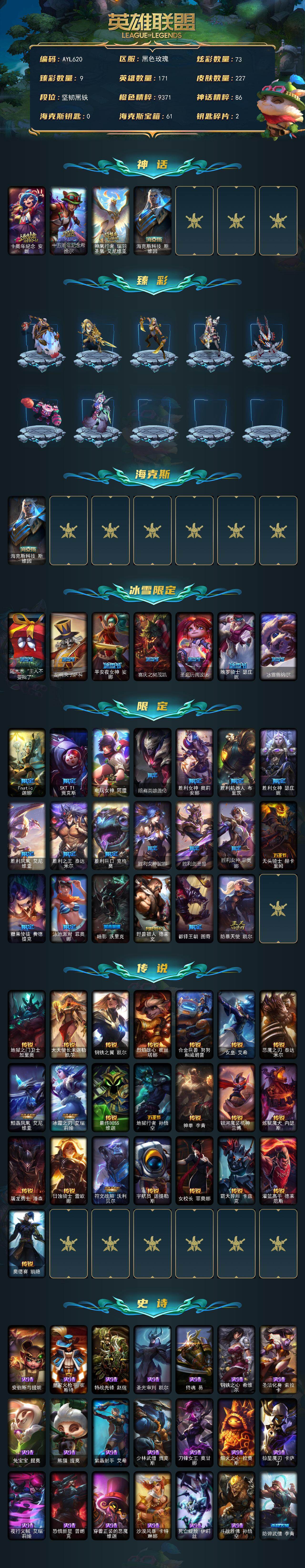 【店主推荐捡漏号】未定级段位-171英雄-227皮肤-73炫彩-0终极-4神话-28限定-22传说-48史诗
