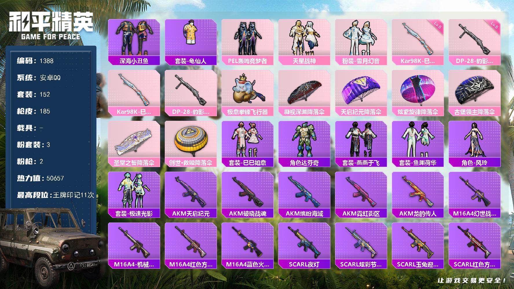 【过年不打烊·联系客服秒发货·3粉装2特效枪·深海小丑鱼·外观酷似项羽·11王牌印记·地铁有天赋】安卓 手Q-3粉装-2特效枪-0载具-2粉色飞行器-50657热力值-11王牌印记-152套装-185枪皮