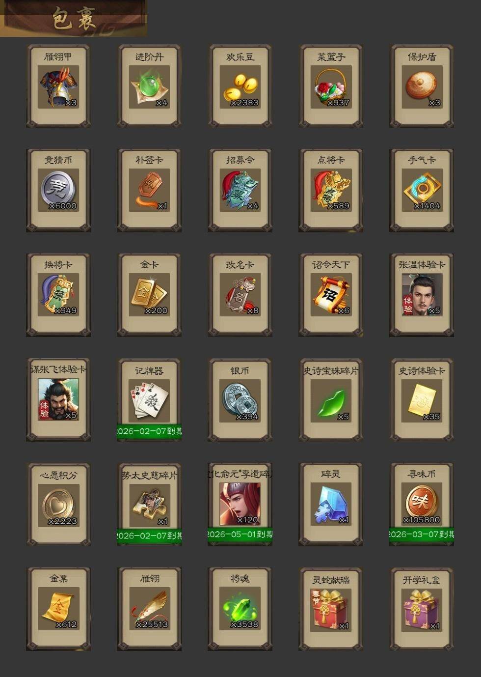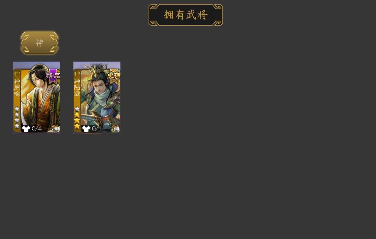 神陆逊,马云騄,花鬘,谋陆逊,神周瑜,SP关羽,乐进,曹昂,诸葛诞,朱灵,SP姜维,钟会,曹冲,郭淮,界王异,界曹操,界司马懿,界夏侯惇,界张辽,李典,曹真,韩浩史涣,陈群,钟繇,司马朗,