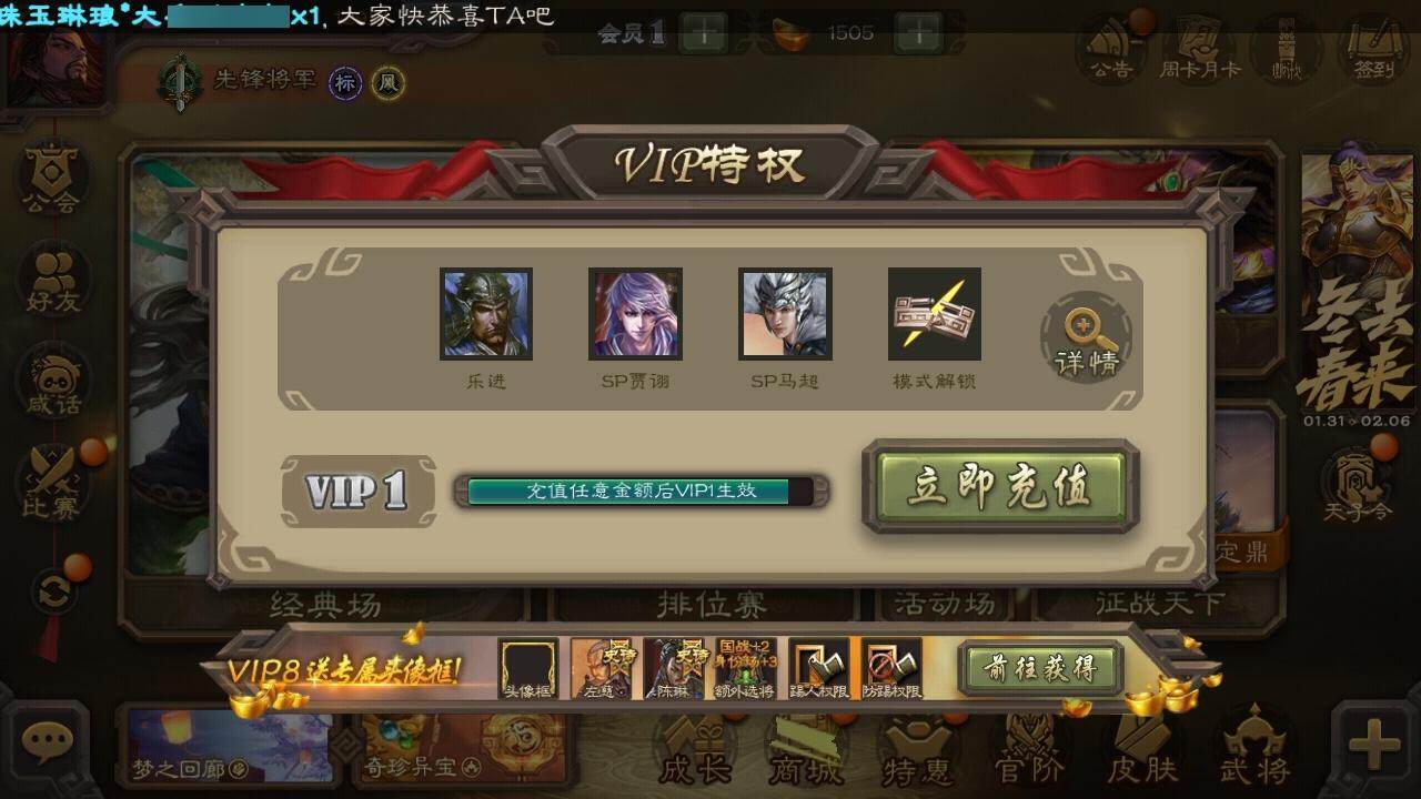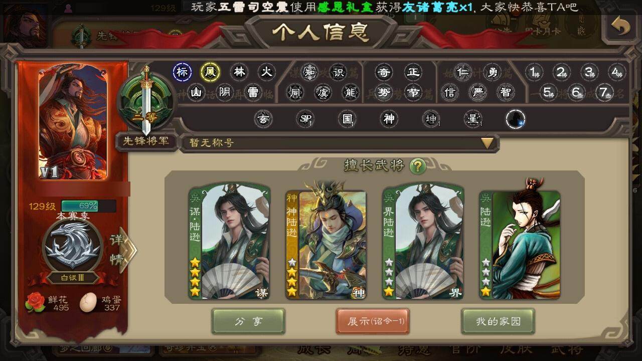 官阶:先锋将军;VIP等级:VIP1;史诗武将数量:4;动态皮肤数量:3;武将
