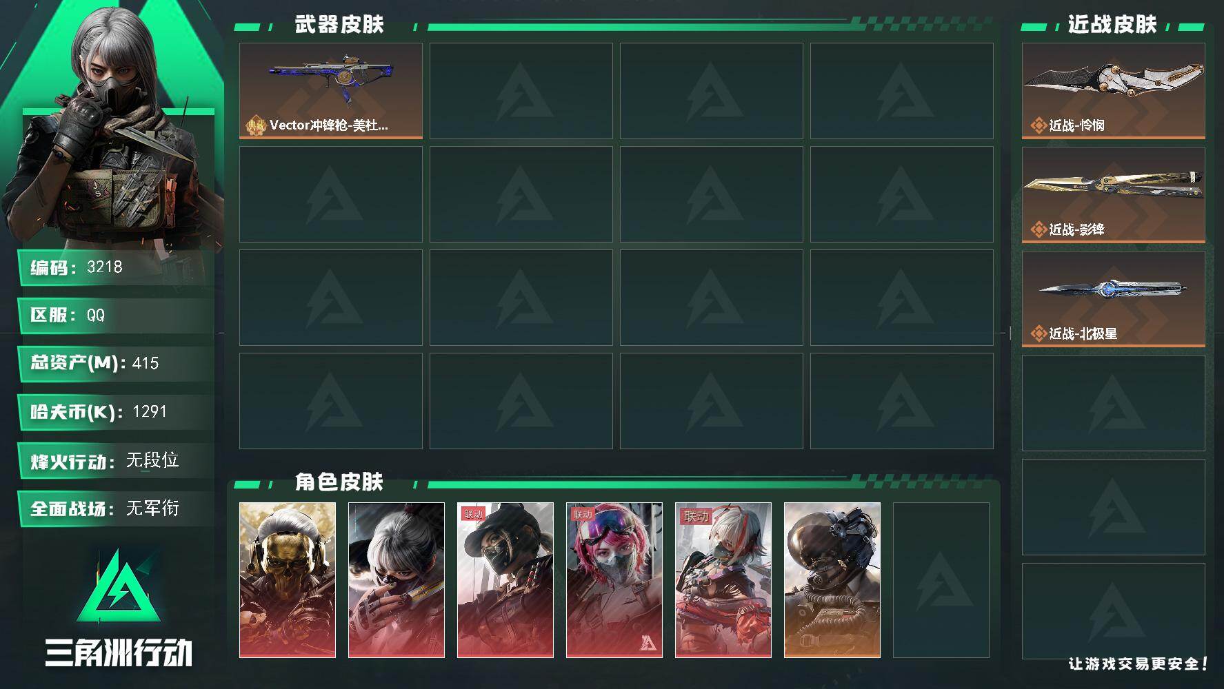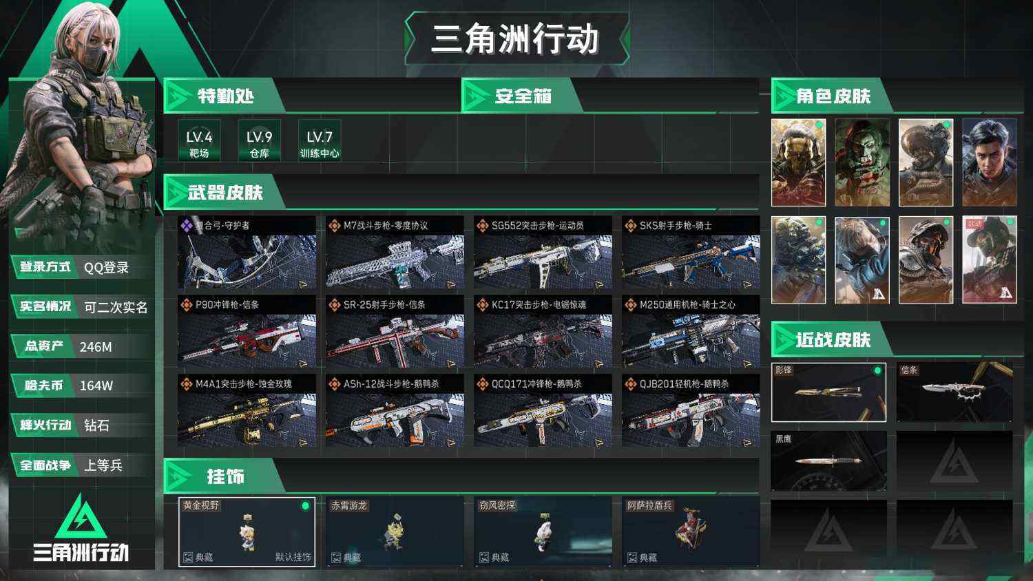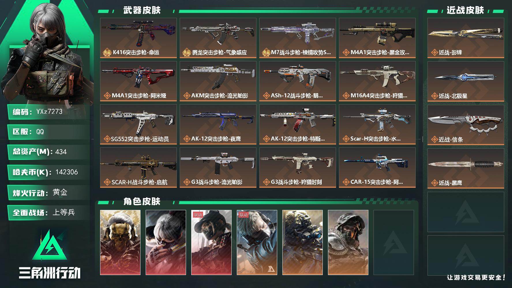 【sjs7761】总资产242m 等级60 49+咖啡豆 39发aw 影锋 信条 露娜天际线 金牌射手 飞虎彦祖 壮志凌云 红狼玫瑰 电锯惊魂 烽火地带段位: 钻石 全面战场段位: 上等兵 总资产: 246000000 哈夫币: 1644000 sjs7761 干员外观: 红狼-蚀金玫瑰,威龙-壮志凌云(S3),无名-夜鹰(S4),威龙-飞虎,蜂医-送葬人·无题密令(S5),露娜-黑·天际线,深蓝-不破誓约(S6),红狼-电锯惊魂,露娜-金牌射手(S7) 传说武器皮肤: M4A1突击步枪-蚀金玫