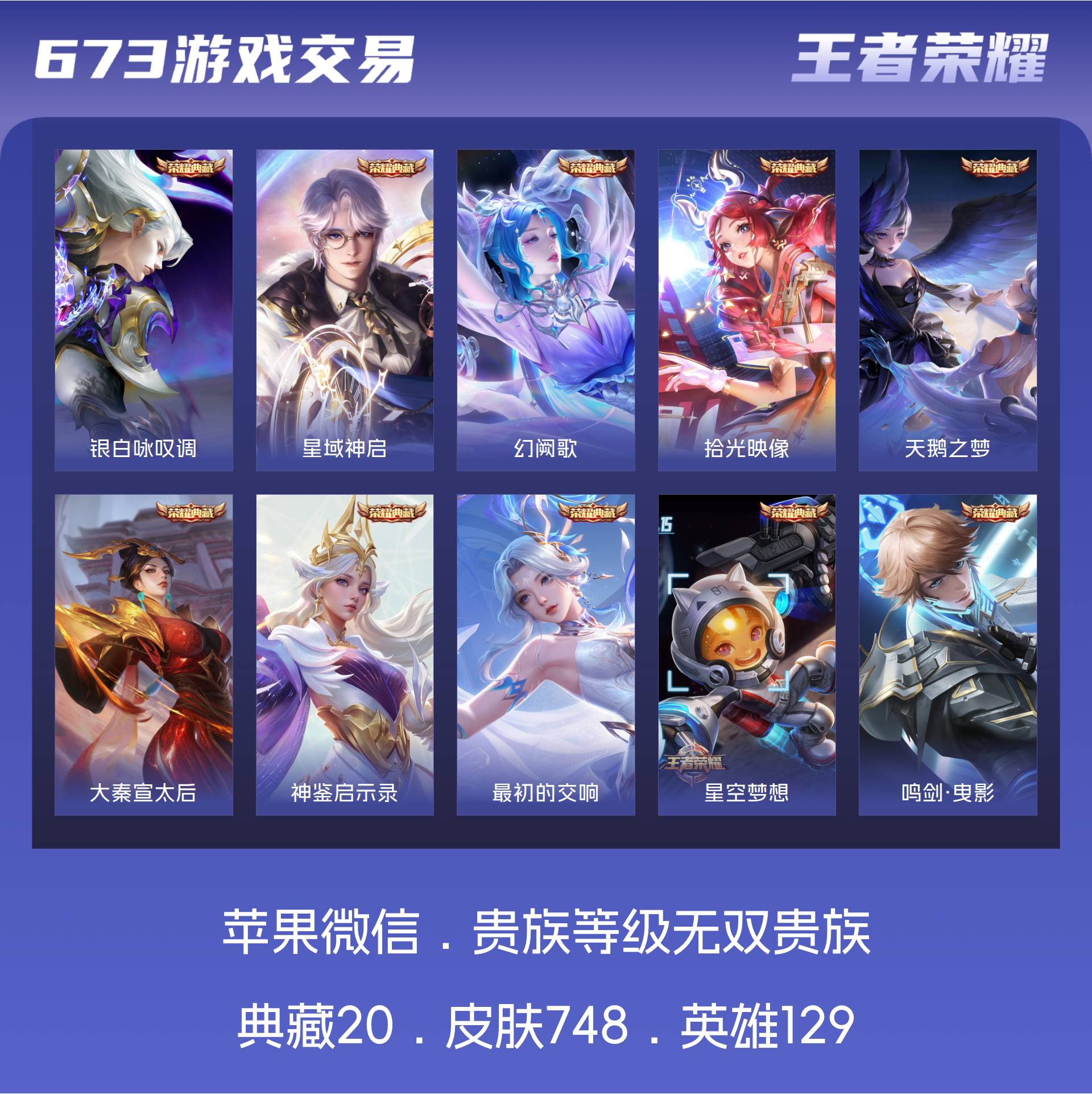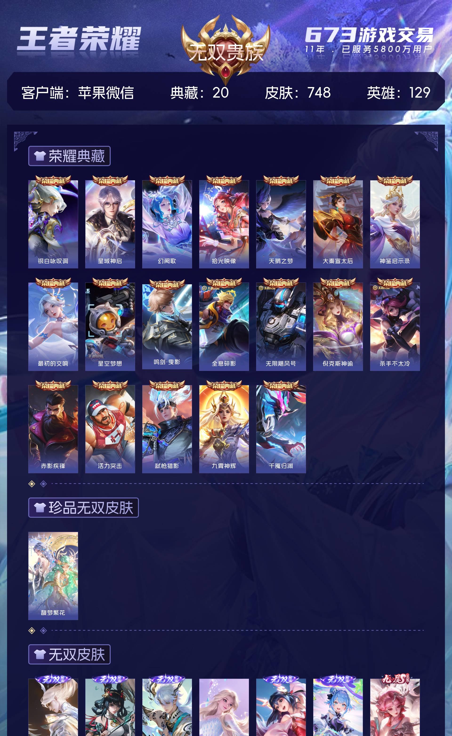 苹果微信 皮肤748 英雄129 永恒钻石 荣耀典藏20 珍品无双1 无双皮肤13 珍品传说9 传说130 其他皮肤578-背包两个水晶