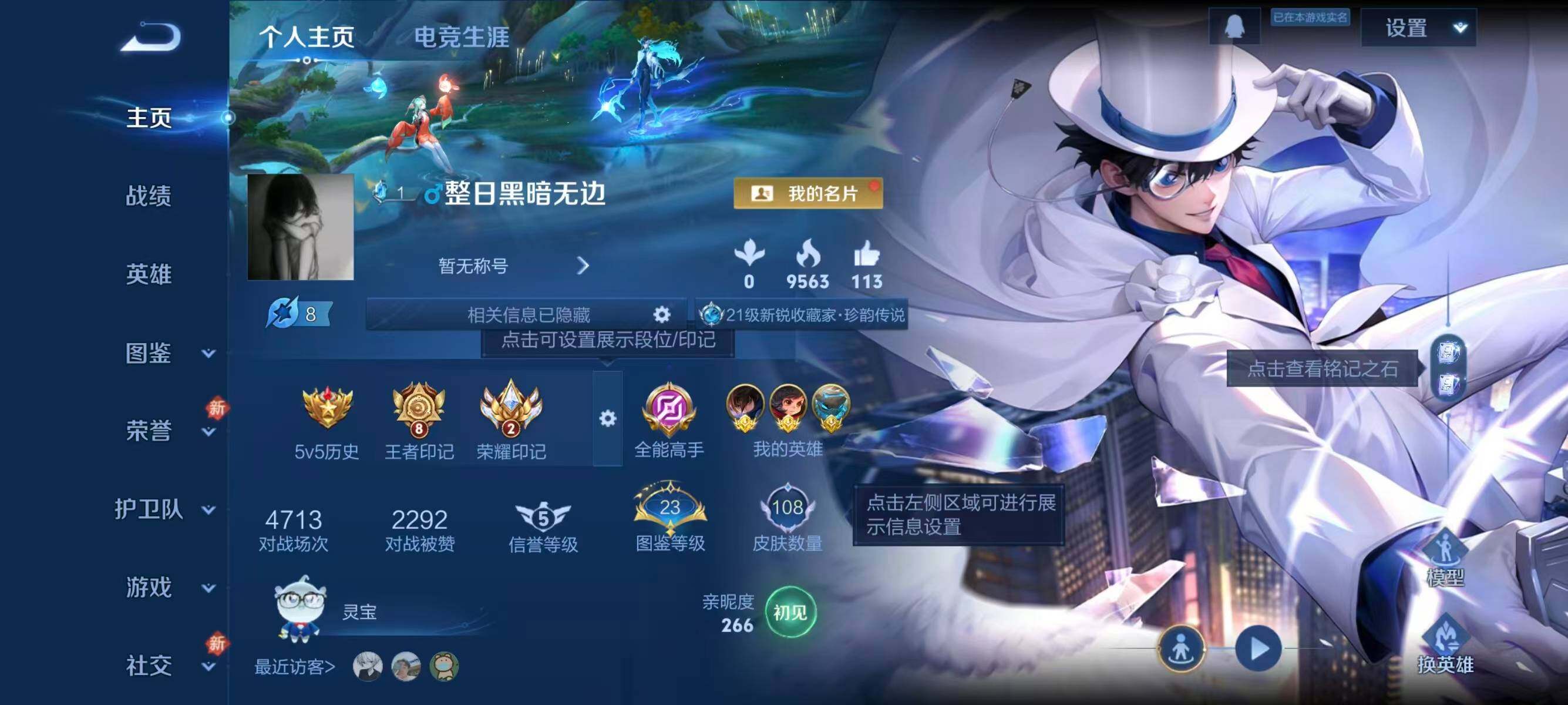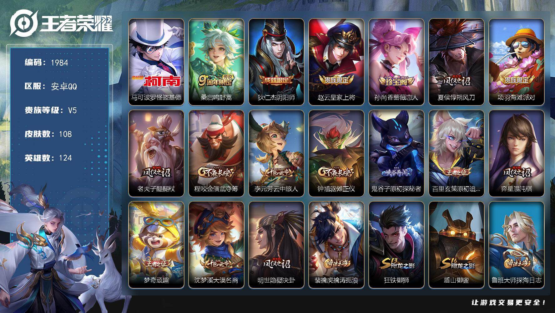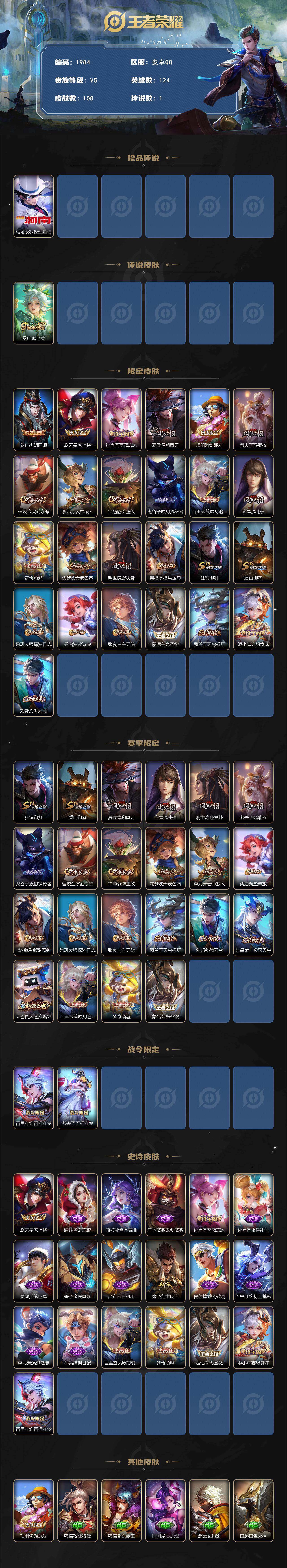 【过年不打烊·怪盗基德·3金标·金标澜·金标李元芳·金标盾山·满级铭文·100+小花花·v5】安卓Q-V5-尊贵铂金IV段位-124英雄-108皮肤-1珍品传说-1传说-19史诗