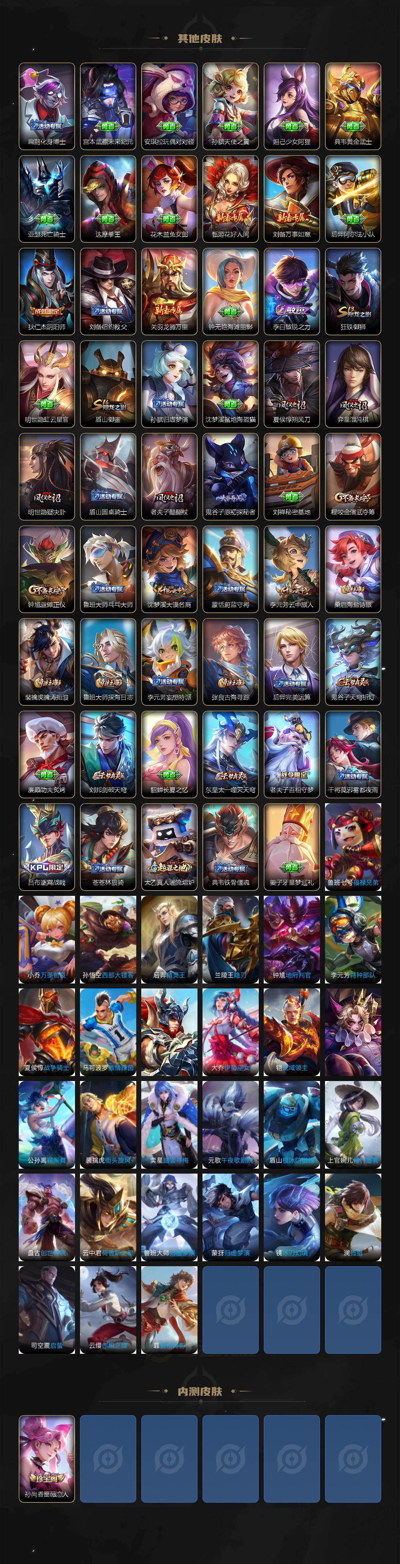【限定皮肤】:狄仁杰阴阳师,赵云皇家上将,孙尚香蔷薇恋人,夏侯惇朔风刀,项羽海滩派对,老夫子醍醐杖,程咬金演武夺筹,李元芳云中旅人