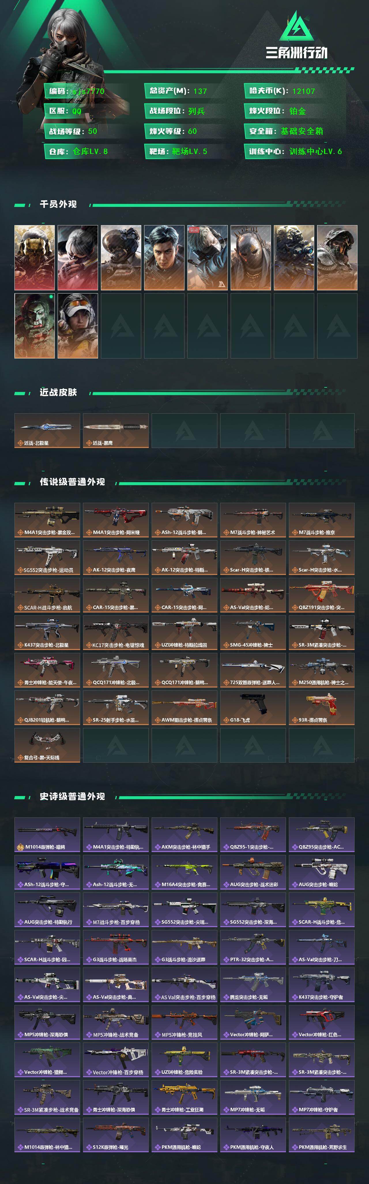 【sjs7770】过亿资产 蚀金飞虎 水墨北极星极品跑刀号!! 烽火地带段位: 铂金 全面战场段位: 列兵 总资产: 137000000 哈夫币: 12107000 sjs7770 干员外观: 红狼-蚀金玫瑰,牧羊人-街头之王(S2),威龙-壮志凌云(S3),骇爪-水墨云图,无名-夜鹰(S4),威龙-飞虎,蜂医-送葬人·无题密令(S5),深蓝-不破誓约(S6),红狼-电锯惊魂,露娜-金牌射手(S7) 传说武器皮肤: M4A1突击步枪-蚀金玫瑰,M7战斗步枪-维京,M7战斗步枪-神秘艺术,SCAR