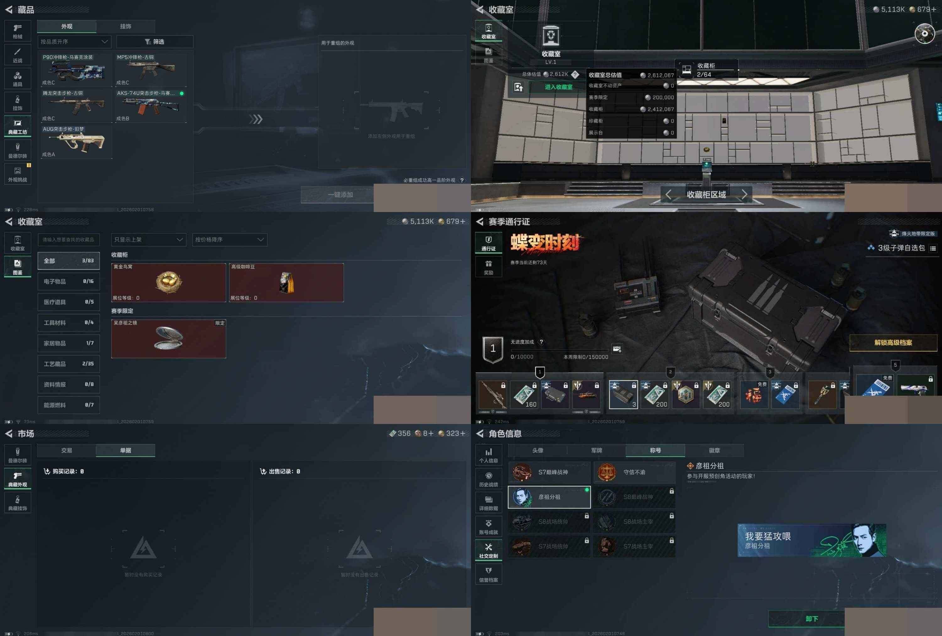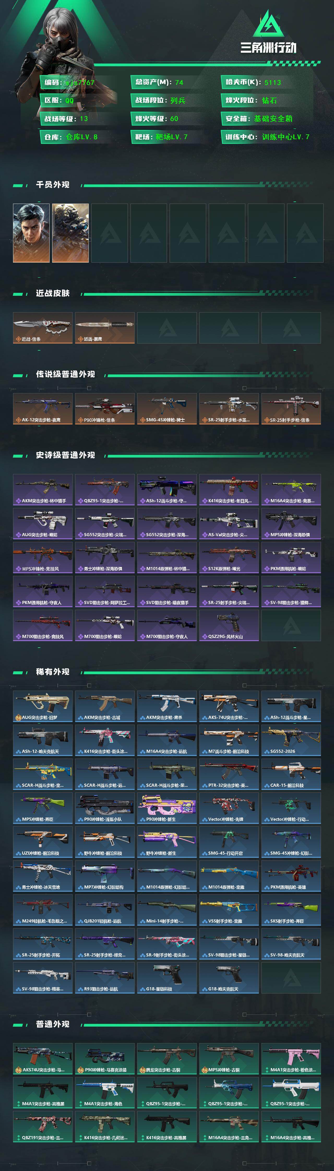 【sjs7767】信条 飞虎顶级护航号 烽火地带段位: 钻石 全面战场段位: 列兵 总资产: 74000000 哈夫币: 5113000 sjs7767 干员外观: 无名-夜鹰(S4),威龙-飞虎 传说武器皮肤: SR-25射手步枪-水墨云图,AK-12突击步枪-夜鹰,SMG45冲锋枪-骑士,近战-信条,P90冲锋枪-信条,SR-25射手步枪-信条 史诗武器皮肤: M700狙击步枪-竞技风,SVD狙击步枪-阿萨拉工艺,QBZ95-1突击步枪-曙光,S12K霰弹枪-曙光,AUG突击步枪-蝮蛇,M7