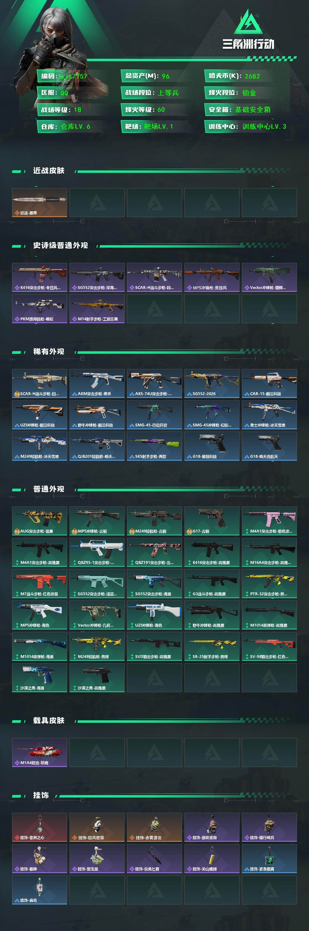 【sjs7757】总资产95m 等级60 特勤体力3负重1 烽火地带段位: 铂金 全面战场段位: 上等兵 总资产: 96000000 哈夫币: 2682000 sjs7757 史诗武器皮肤: PKM通用机枪-蝮蛇,SG552突击步枪-深海恐惧,SCAR-H战斗步枪-囚徒,Vector冲锋枪-猎鳄行动,MP5冲锋枪-竞技风,K416突击步枪-冬日风情,M14射手步枪-工业狂潮 载具皮肤: M1A4坦克-驯鹿 亮点: 96m总资产-2682k哈伏币-60烽火等级-铂金-18战场等级-上等兵【近战皮肤