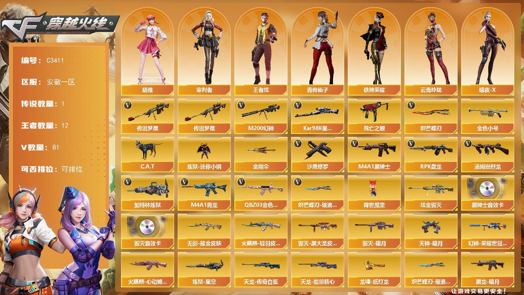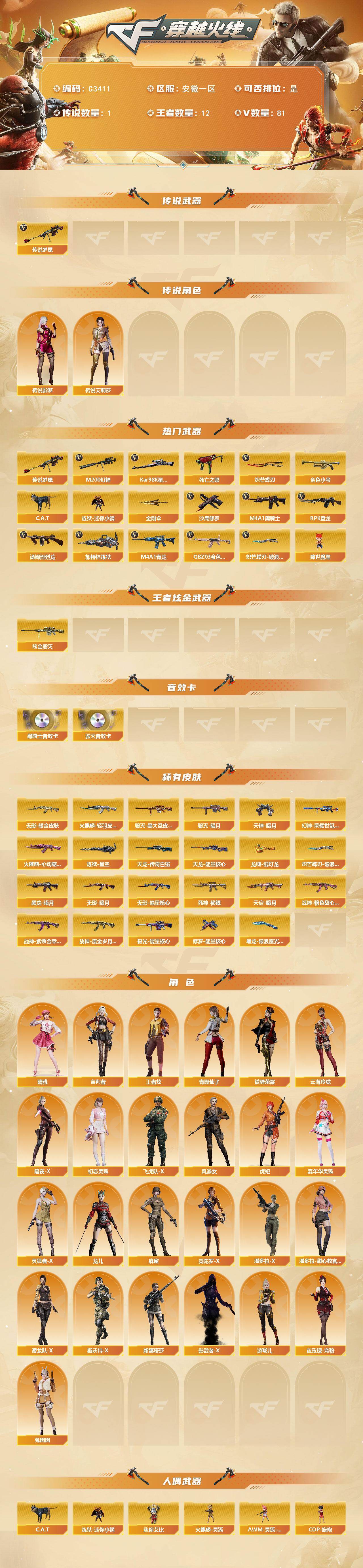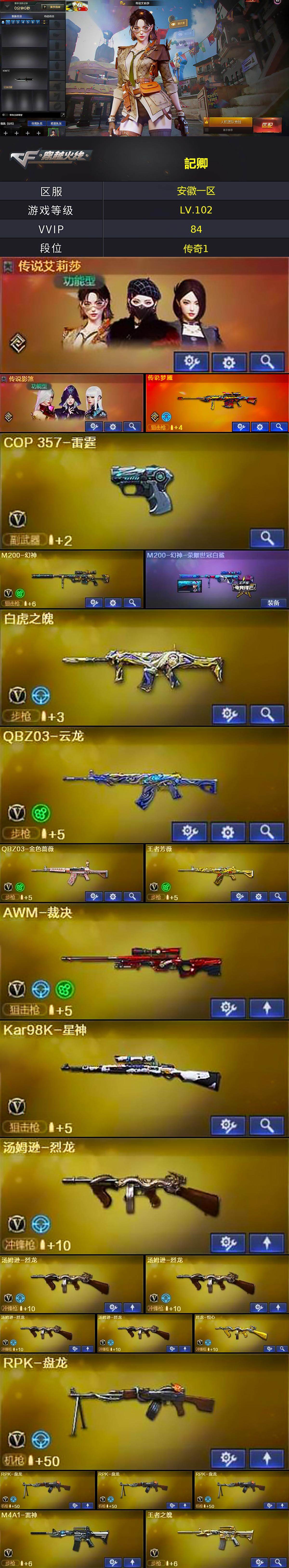 【C3411】安徽一区-81V-12王者-1炫金【传说影煞】【传说艾莉莎】【传说梦魇】【M200-幻神】【M200-幻神-荣耀世冠白鲨】【Kar98K-星神】【星神-炽天使】【AWM-裁决】【白虎之魄-觉醒版】【QBZ03-金色蔷薇】【QBZ03-云龙】【王者芳薇-觉醒版】【M4A1-青龙】【雷霆之契】【炽芒蝶刃】【炽芒蝶刃-破浪逐光 皮肤】【炼狱-迷你小钢】【加特林-炼狱】【RPK-盘龙】【魂·炼狱-玩具枪】【汤姆逊-烈龙】【烈龙-悦心-觉醒版】【死亡之眼】【传说艾莉莎】【传说影煞】【晴雅】【