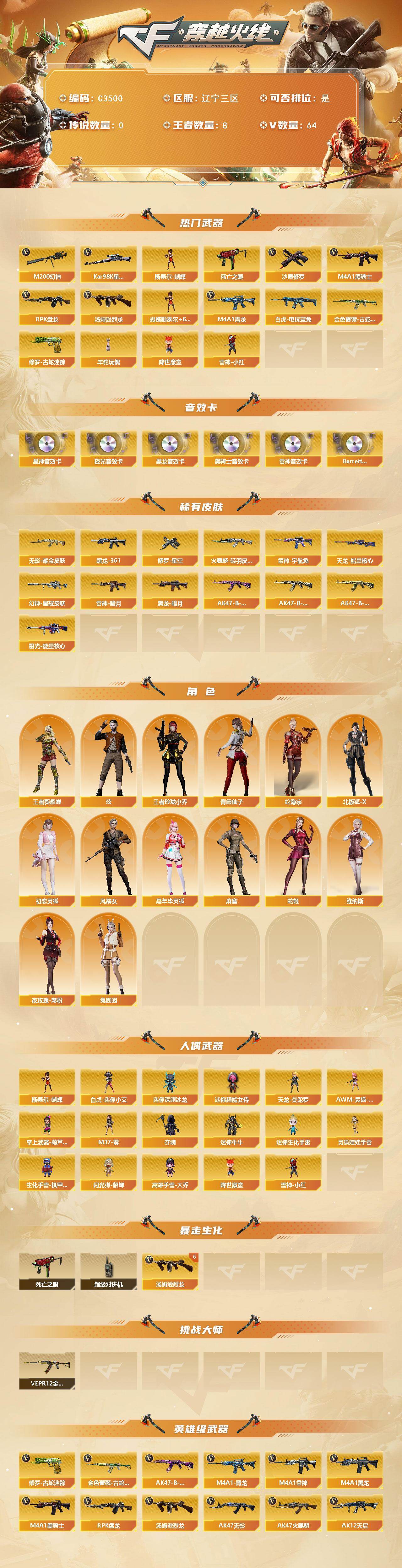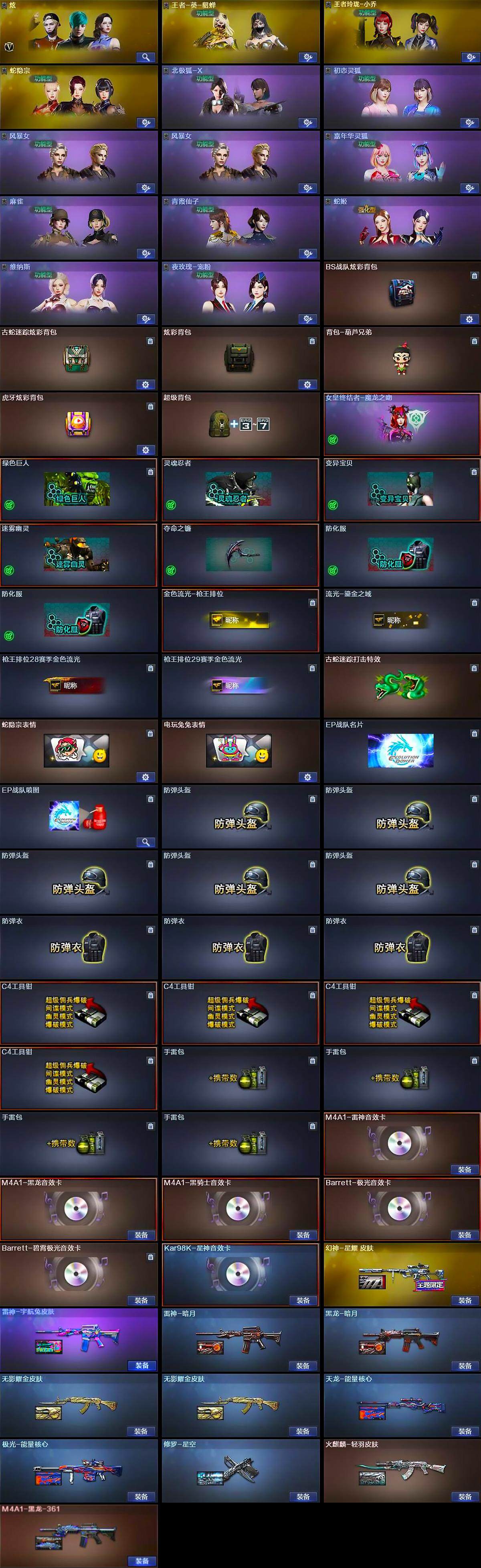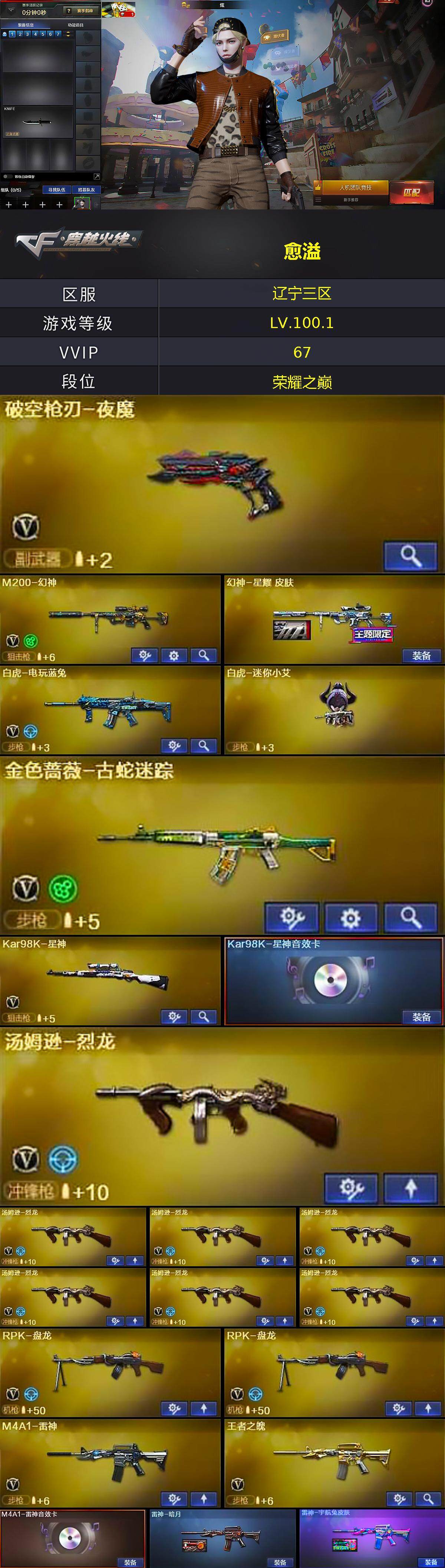 【热门武器】:M4A1-青龙,M200-幻神,金色蔷薇-古蛇迷踪,修罗-古蛇迷踪,死亡之眼,白虎-电玩蓝兔,Kar98K-星神,M4A1-黑骑士,汤姆逊-烈龙*7,RPK-盘龙*2,斯泰尔-蝴蝶,羊驼玩偶,降世魔童*2,雷神-小红,沙鹰-修罗*3