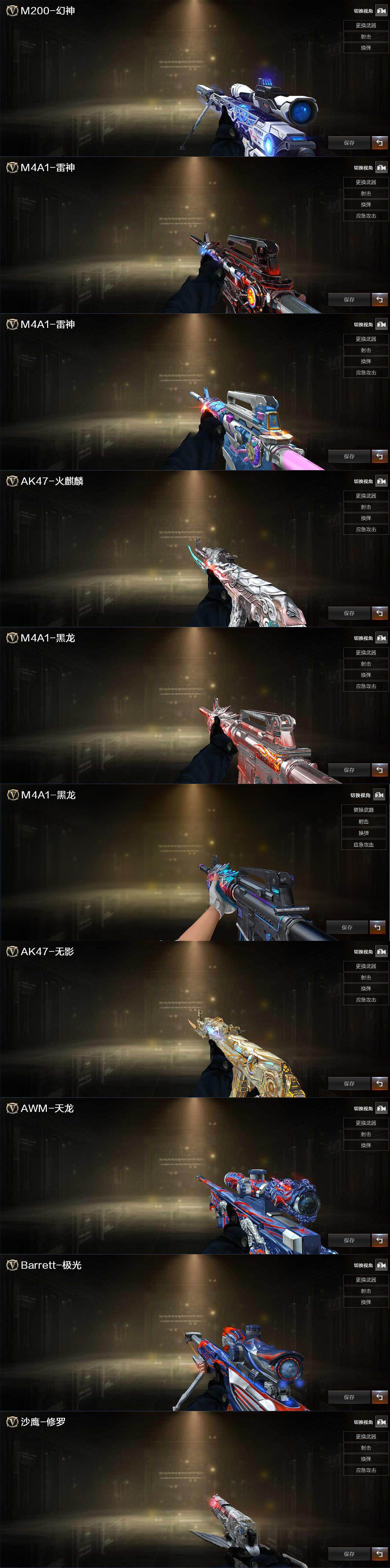 【音效卡】:M4A1-雷神音效卡,M4A1-黑龙音效卡,M4A1-黑骑士音效卡,Barrett-极光音效卡,Kar98K-星神音效卡,Barrett-碧霄极光音效卡