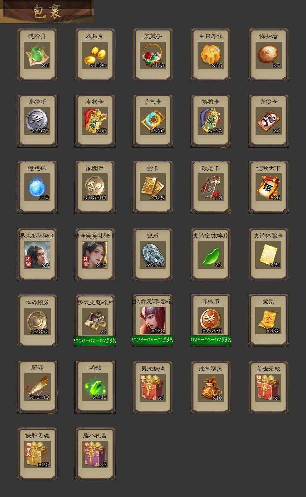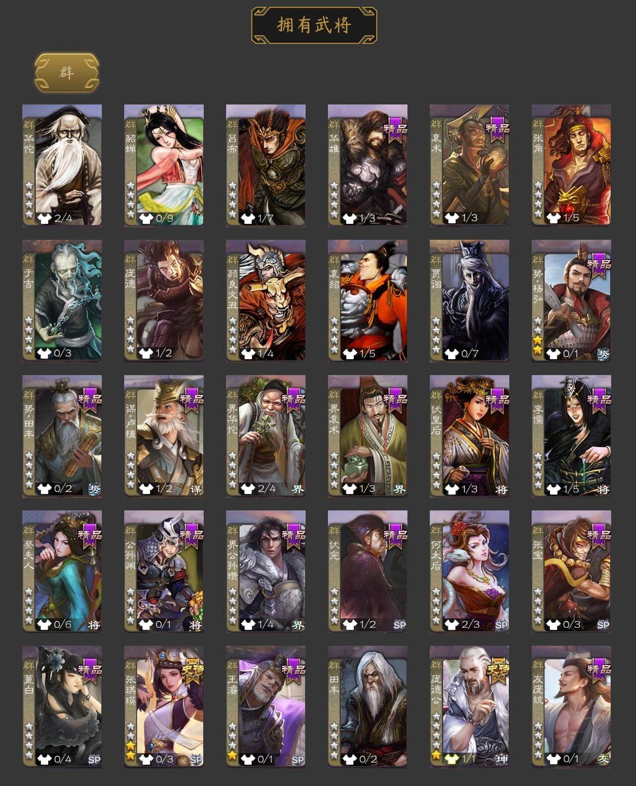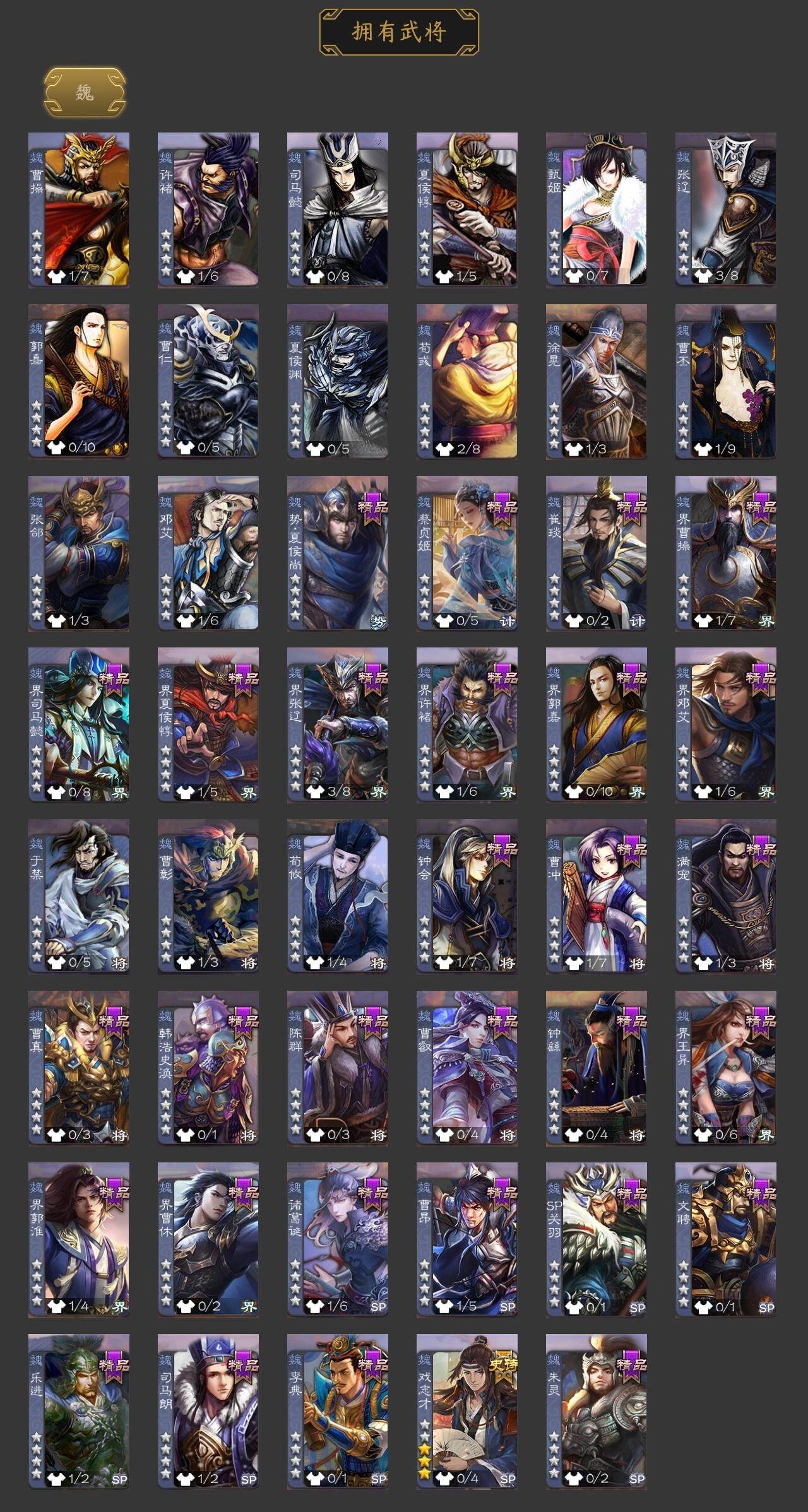 神司马懿,戏志才,马云騄,张琪瑛,庞德公,神吕蒙,神周瑜,势夏侯尚,SP关羽,乐进,曹昂,诸葛诞,朱灵,文聘,钟会,曹冲,满宠,界王异,界曹操,界司马懿,界夏侯惇,界张辽,界许褚,界郭嘉,李