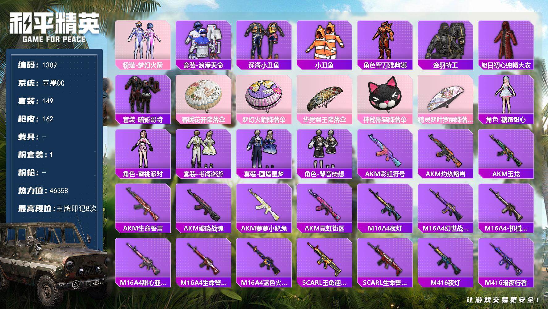 【过年不打烊·身法素材号·男神号·梦幻火箭·深海小丑鱼·暗影哥特·鲨鱼·金羽特工·狂鲨舞者·小丑鱼背包·身法号】苹果 手Q-1粉装-0特效枪-0载具-0粉色飞行器-46358热力值-8王牌印记-149套装-162枪皮