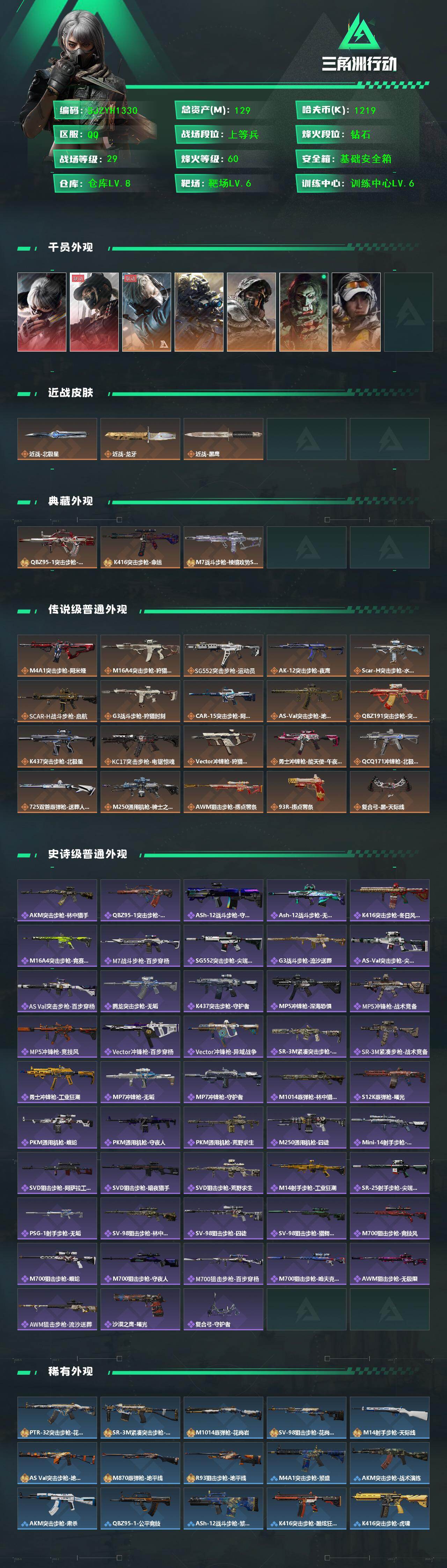 【SJZYH1330】总资产(M):129M/哈夫币(K):1219K/哈夫币(K):1219K/传说枪皮数:23/全面战场等级:29_段位:上等兵/烽火地带等级:60_段位:钻石/骇爪-水墨云图/露娜-黑·天际线/蜂医-送葬人·无题密令/无名-夜鹰/深蓝-不破誓约/红狼-电锯惊魂/露娜-金牌射手/近战-北极星/近战-龙牙/近战-黑鹰/QBZ95-1突击步枪-王牌之剑/K416突击步枪-命运/M7战斗步枪-棱镜攻势S2/M4A1突击步枪-阿米娅/M16A4突击步枪-狩猎时刻/SG552突击步枪-