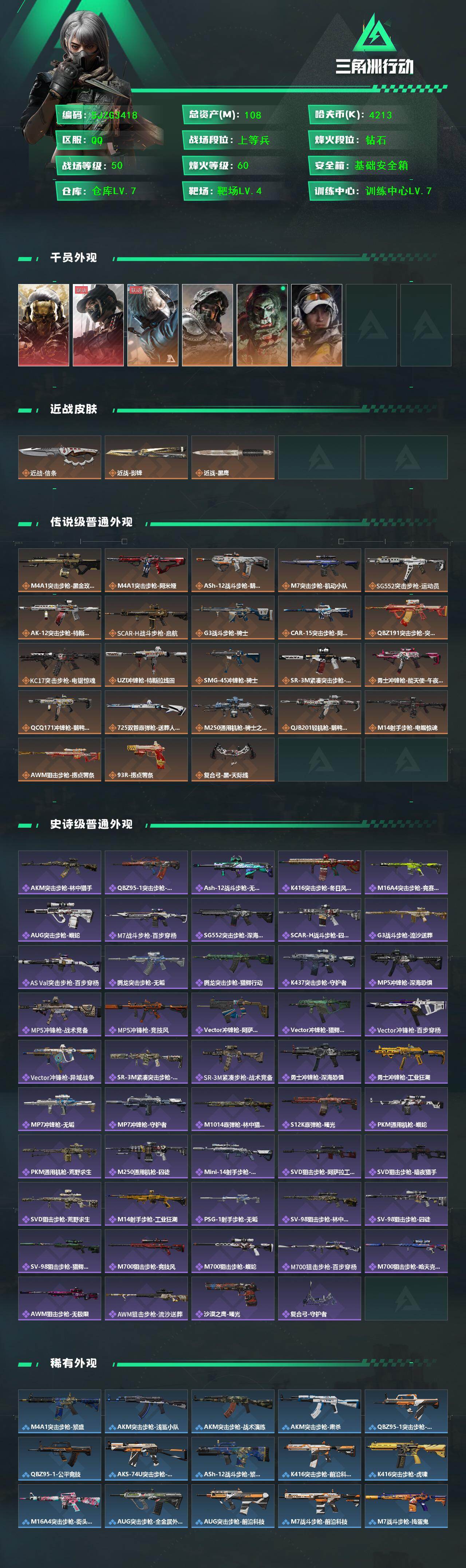 【SJZG3418】总资产(M):108M/哈夫币(K):4213K/哈夫币(K):4213K/传说枪皮数:23/全面战场等级:50_段位:上等兵/烽火地带等级:60_段位:钻石/红狼-蚀金玫瑰/露娜-黑·天际线/蜂医-送葬人·无题密令/深蓝-不破誓约/红狼-电锯惊魂/露娜-金牌射手/近战-信条/近战-影锋/近战-黑鹰/鹅鸭杀捆绑包/特斯拉线圈捆绑包/捞点薯条捆绑包/M4A1突击步枪-蚀金玫瑰/M4A1突击步枪-阿米娅/ASh-12战斗步枪-鹅鸭杀/M7战斗步枪-机动小队/SG552突击步枪-运