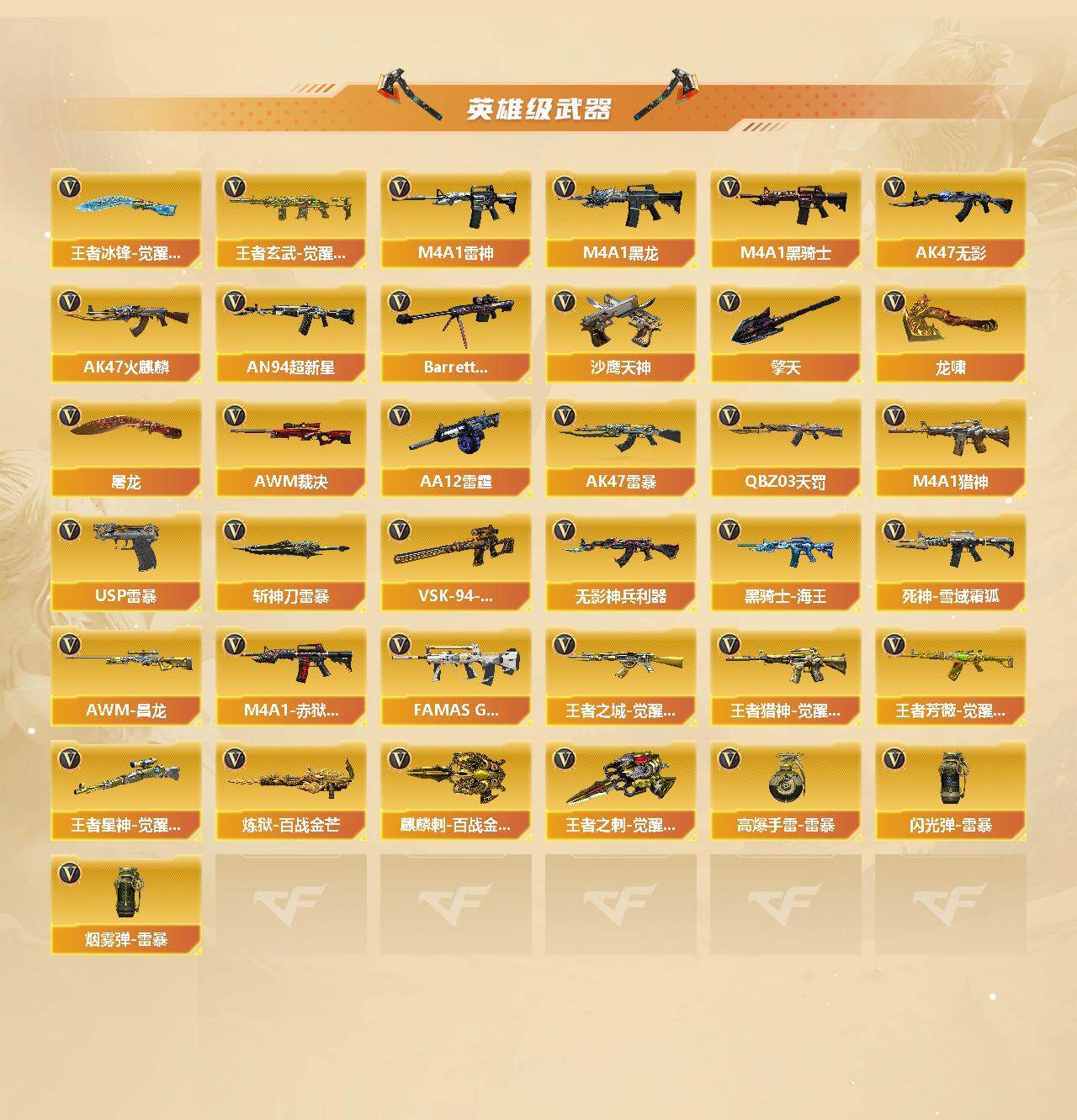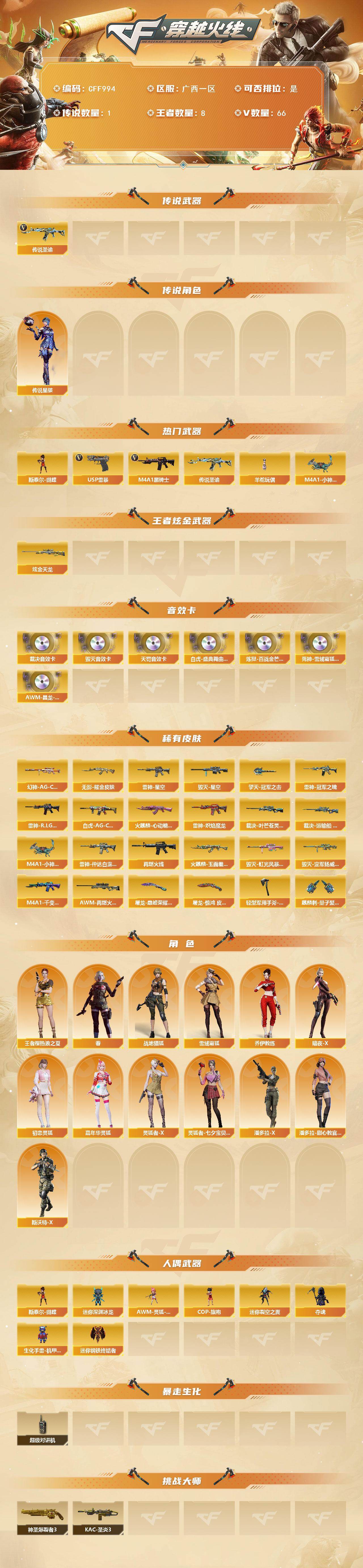 【CFF994】60V/100级/元帅/1传说/8王者/1炫金/6英雄/传说圣谕/传说星骇/M4A1_黑骑士/蝴蝶/羊驼玩偶/M4A1-小神龙/USP_雷暴/炫金天龙/Barrett-毁灭音效卡/AWM-裁决音效卡/QBZ03-天罚音效卡/白虎-盛典舞曲音效卡/炼狱-百战金芒-庆典舞曲音效卡/死神-雪域霜狐-怀旧音效卡/AWM-昌龙-怀旧音效卡/幻神-AG-CFPL S24冠军 皮肤/白虎-AG-CFPLS20冠军/裁决-叶芒苍灵 皮肤/裁决-运输船 皮肤/雷神-星空/雷神-冠军之魄/雷神-R.