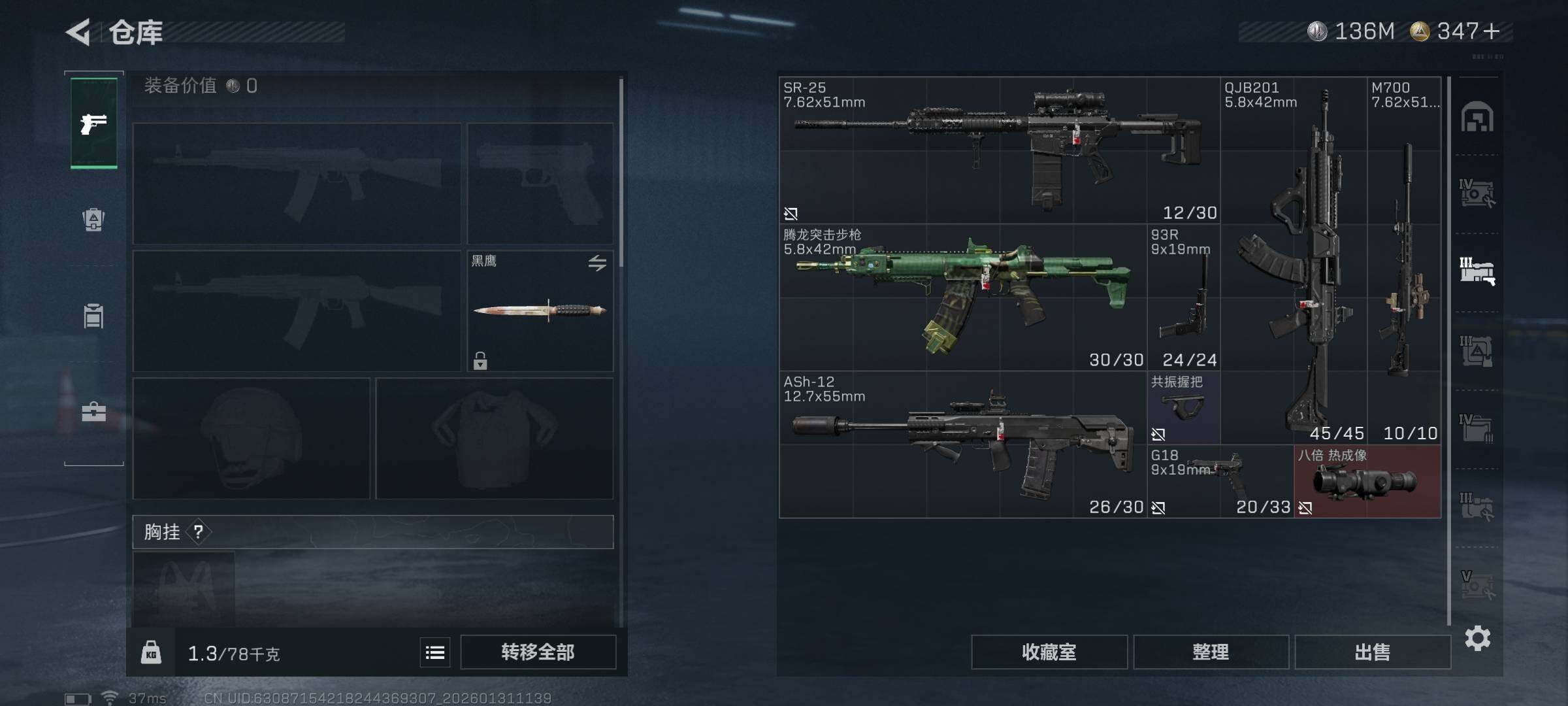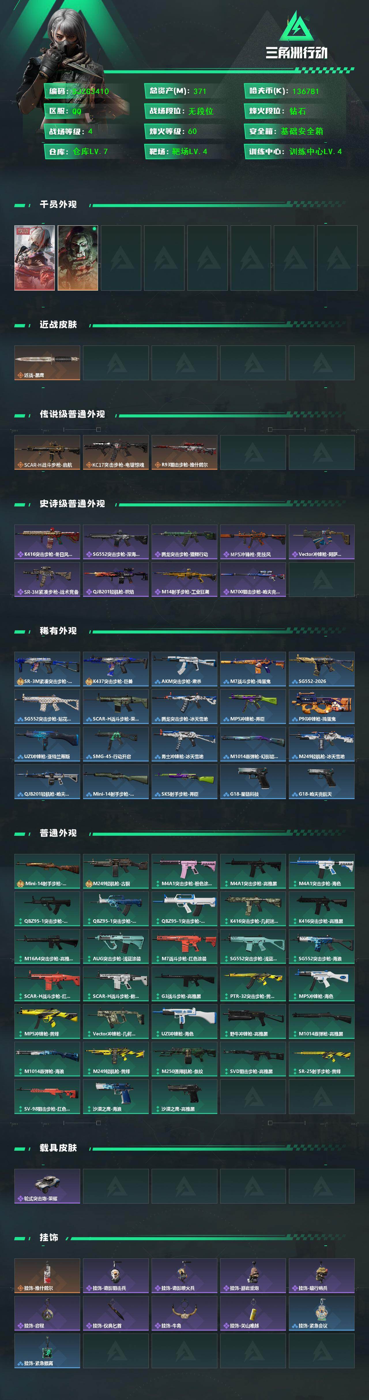 【SJZG3410】总资产(M):371M/哈夫币(K):136781K/哈夫币(K):136781K/传说枪皮数:3/全面战场等级:4_段位:无段位/烽火地带等级:60_段位:钻石/骇爪-维什戴尔/红狼-电锯惊魂/近战-黑鹰/SCAR-H战斗步枪-启航/KC17突击步枪-电锯惊魂/R93狙击步枪-维什戴尔/K416突击步枪-冬日风情/SG552突击步枪-深海恐惧/腾龙突击步枪-猎鳄行动/MP5冲锋枪-竞技风/Vector冲锋枪-阿萨拉文明/SR-3M紧凑突击步枪-战术竞备/QJB201轻机枪-