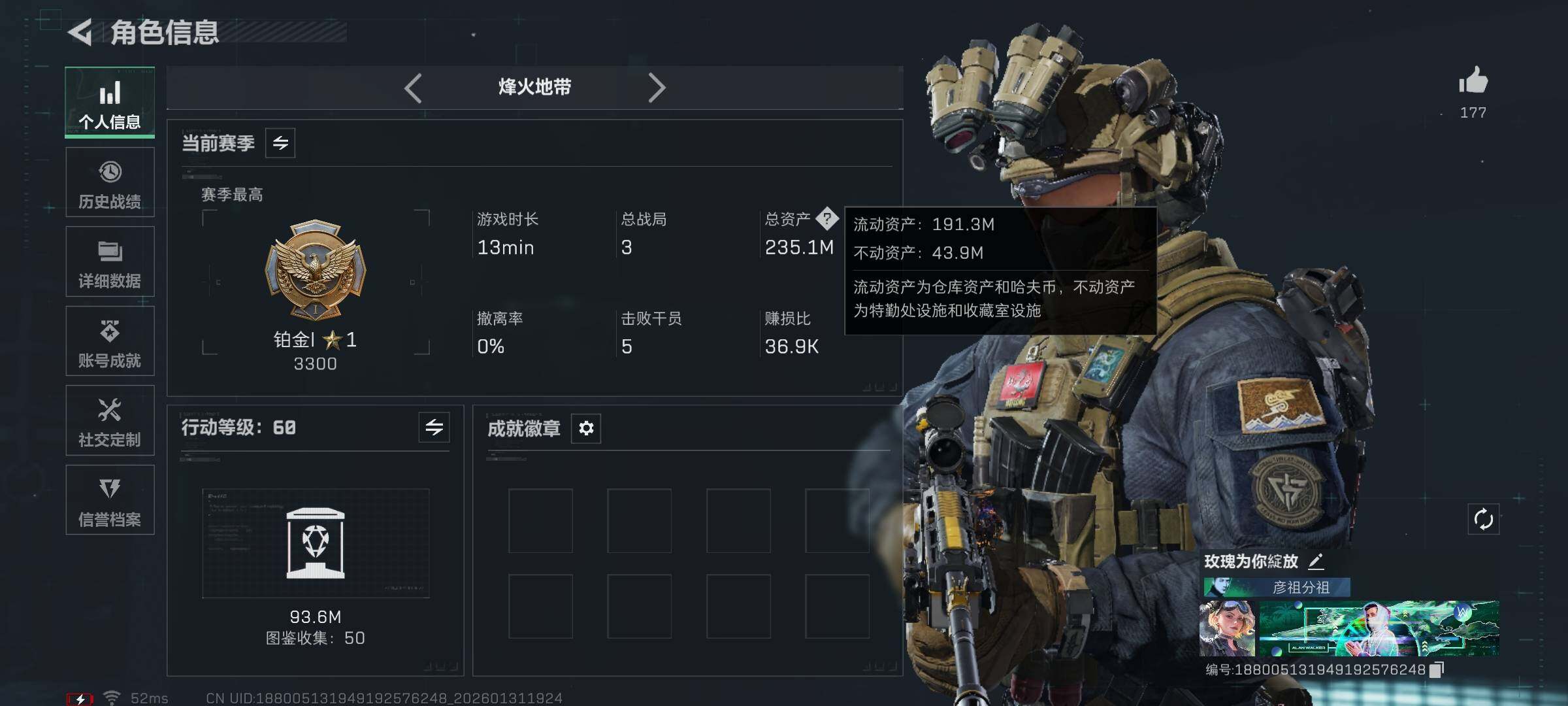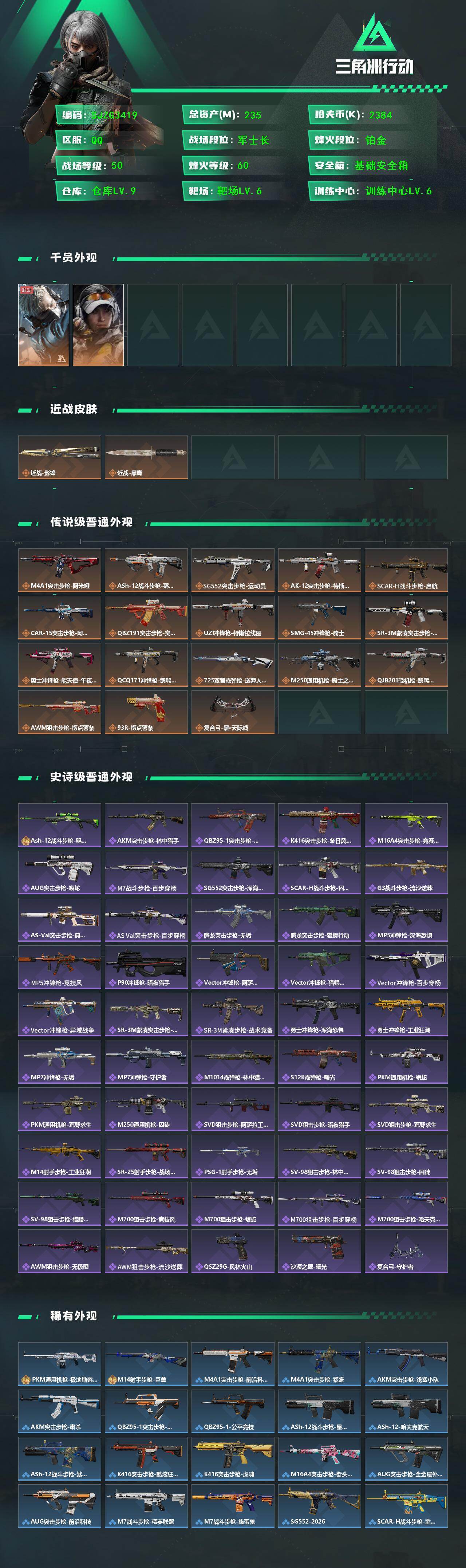 【SJZG3419】总资产(M):235M/哈夫币(K):2384K/哈夫币(K):2384K/传说枪皮数:18/全面战场等级:50_段位:军士长/烽火地带等级:60_段位:铂金/蜂医-送葬人·无题密令/露娜-金牌射手/近战-影锋/近战-黑鹰/M4A1突击步枪-阿米娅/ASh-12战斗步枪-鹅鸭杀/SG552突击步枪-运动员/AK-12突击步枪-特斯拉线圈/SCAR-H战斗步枪-启航/CAR-15突击步枪-阿米娅/腾龙突击步枪-捞点薯条/UZI冲锋枪-特斯拉线圈/SMG-45冲锋枪-骑士/SR-