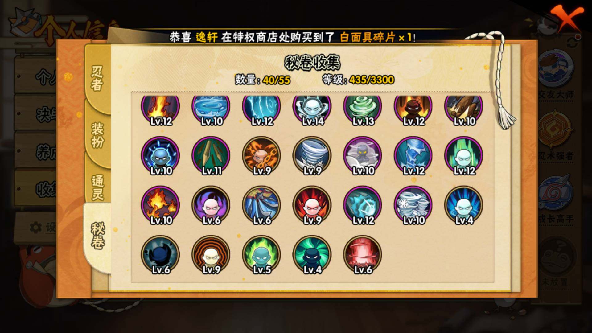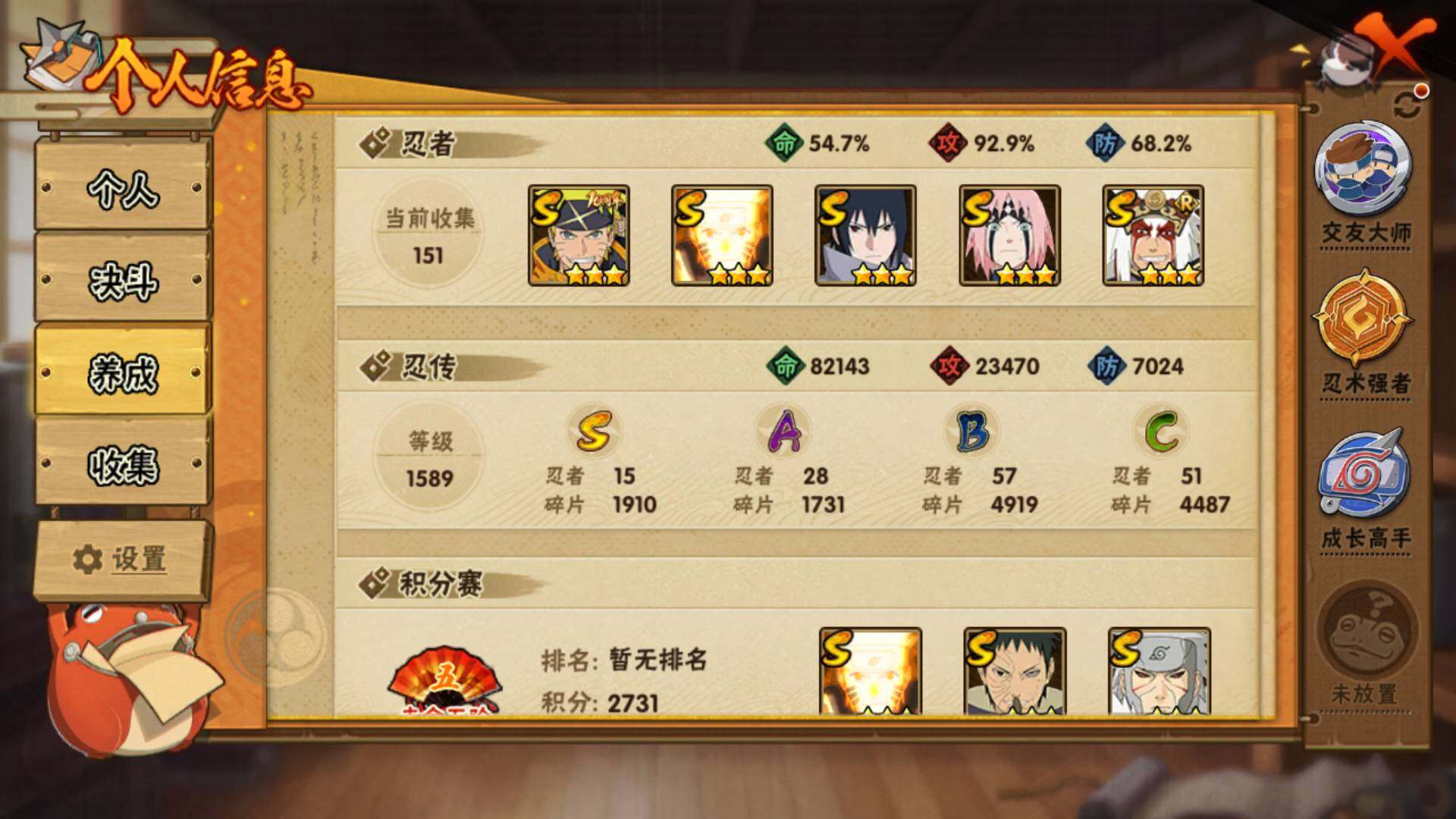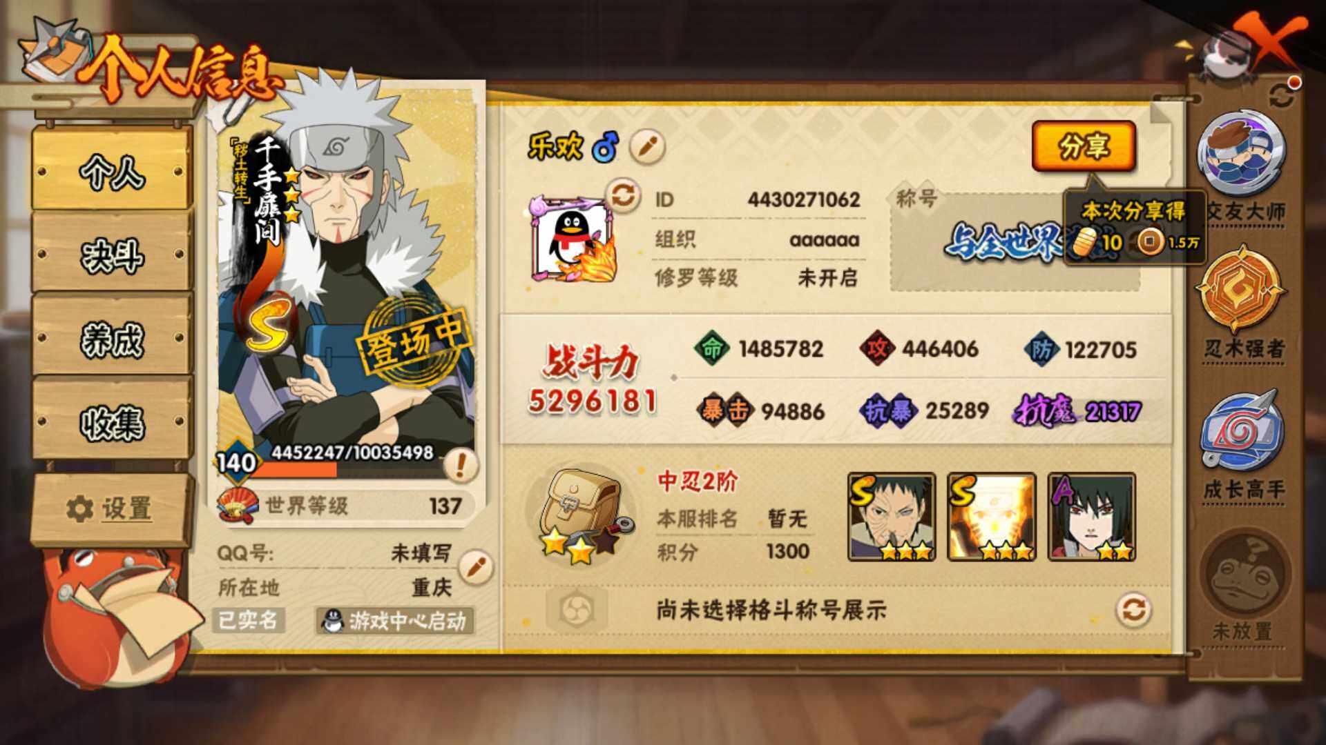 V10 15S 28A 529万战力 6337金币 热门A漂泊六道 面麻、妖怪纲手、新春止水、新春水门。碎片十尾带土35片 白面具75片 忍战大野木86片 金式45片 YY1862