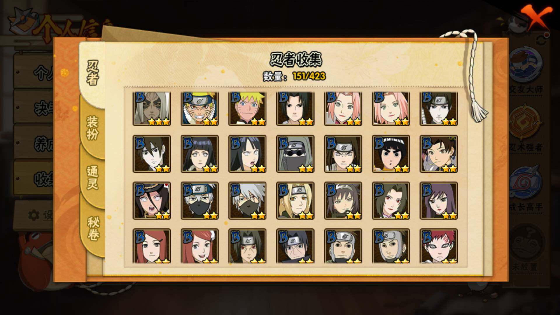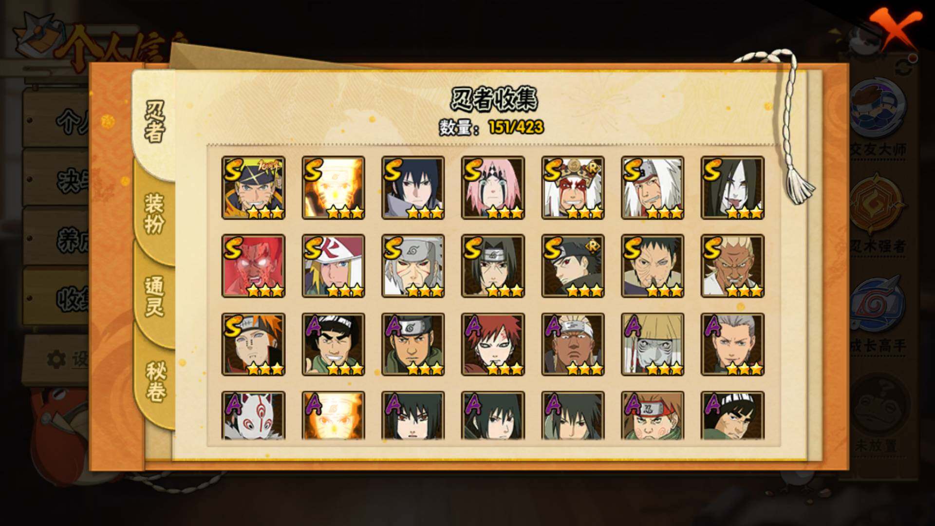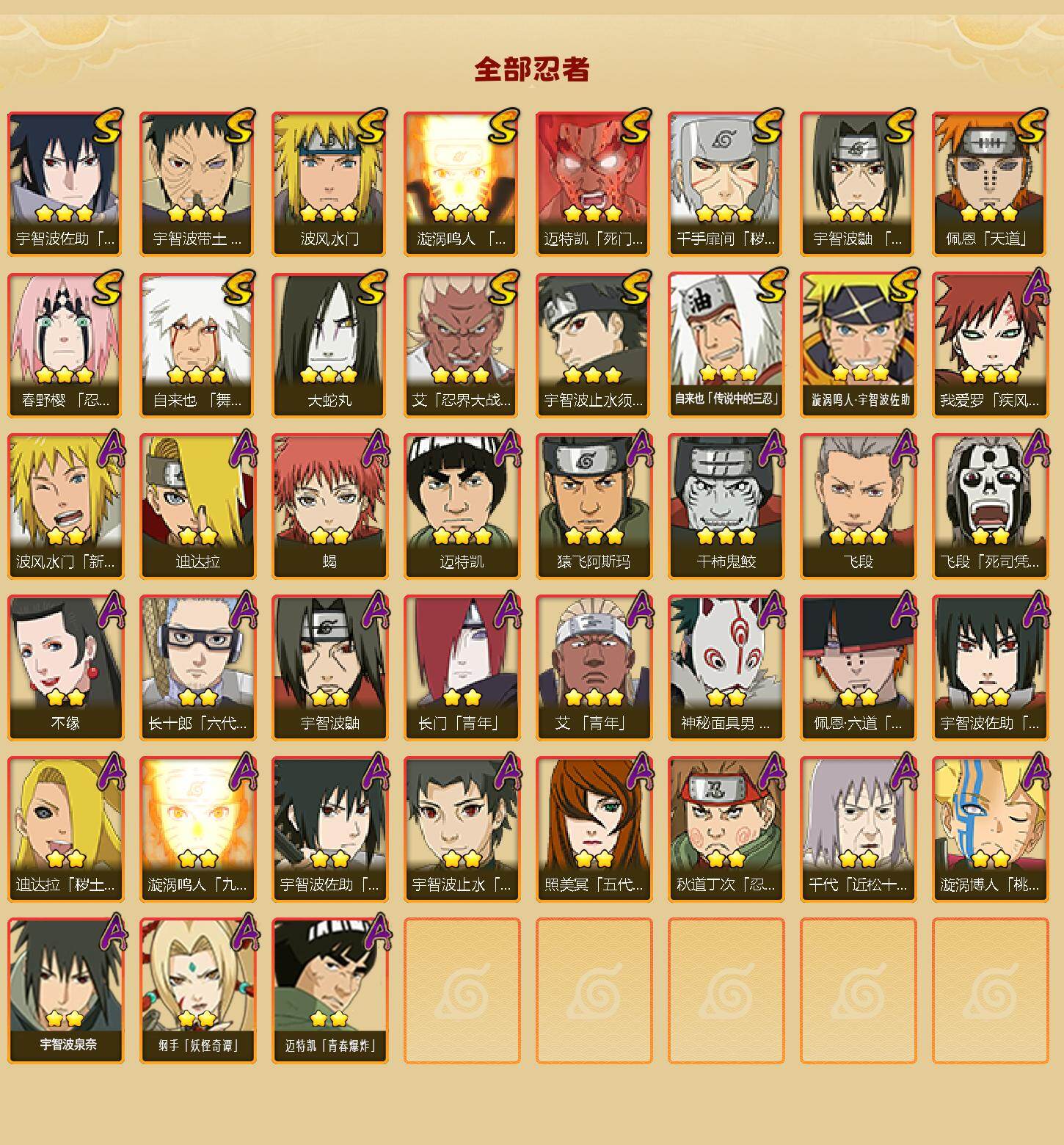 【S级忍者】:千手扉间「秽土转生」(3星),春野樱「忍界大战」(3星),宇智波带土「忍界大战」(3星),艾「忍界大战」(3星),宇智波鼬「须佐能乎」(3星),宇智波止水「须佐能乎」(3星),自来也「舞之豪杰」(3星)