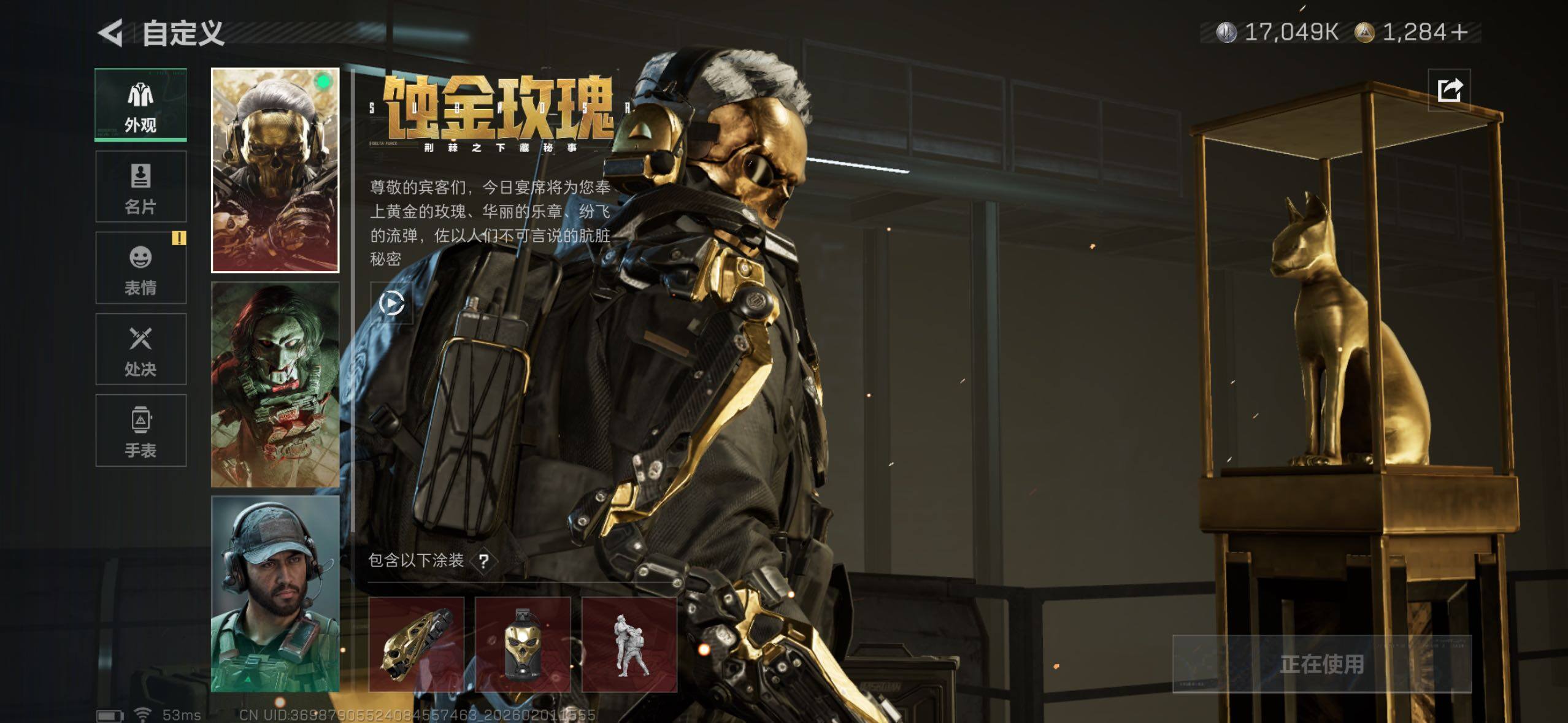 【SJ1000】行动等级:60 总资产:161M 哈夫币:1700W 近战武器:近战武器-信条 干员皮肤:蚀金玫瑰 维什戴尔 典藏外观:M7战斗步枪-棱镜攻势S2