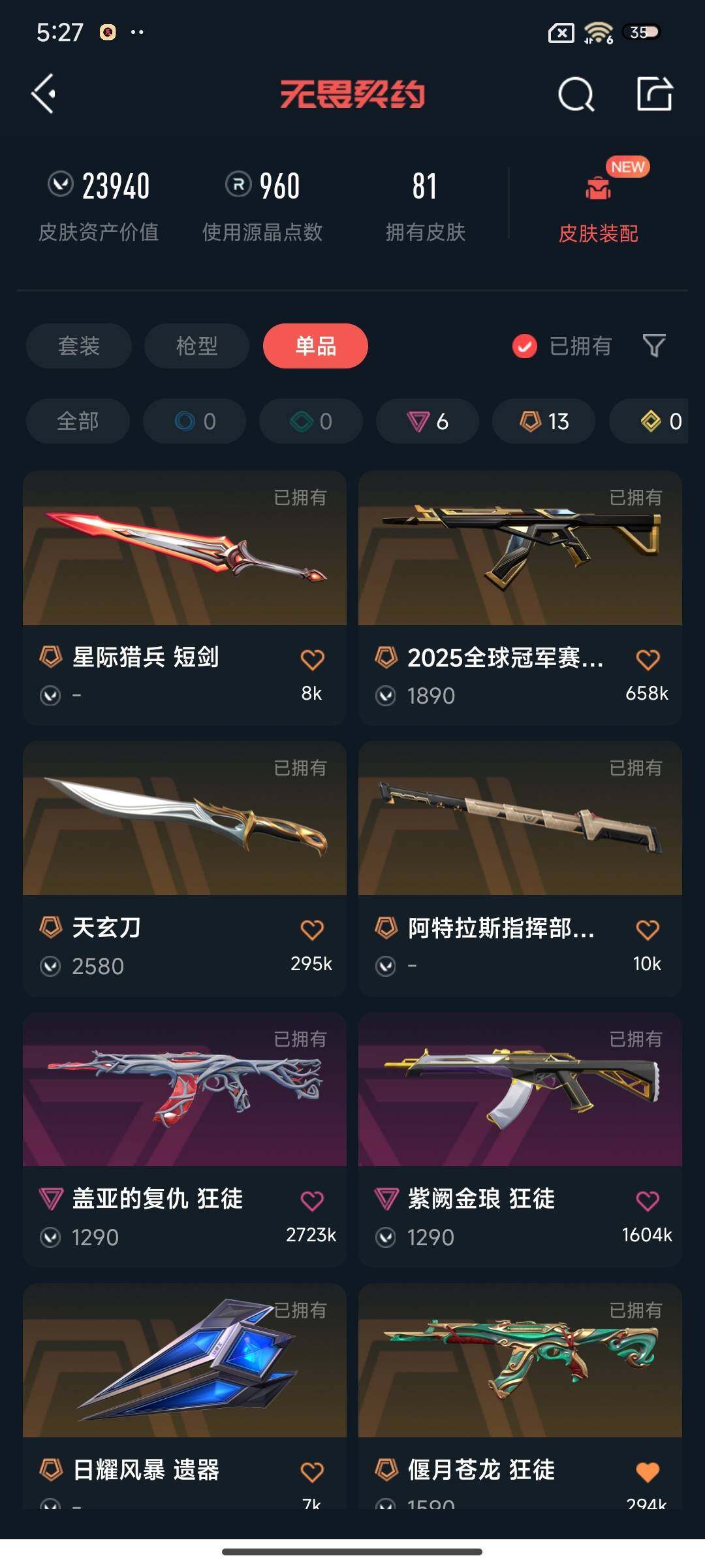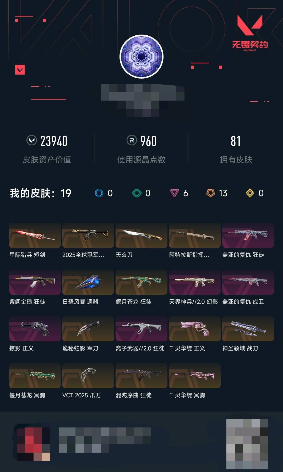 终极*13/卓越*6/皮肤*81/等级*295/段位:铂金/VCT 2025 赛季套装