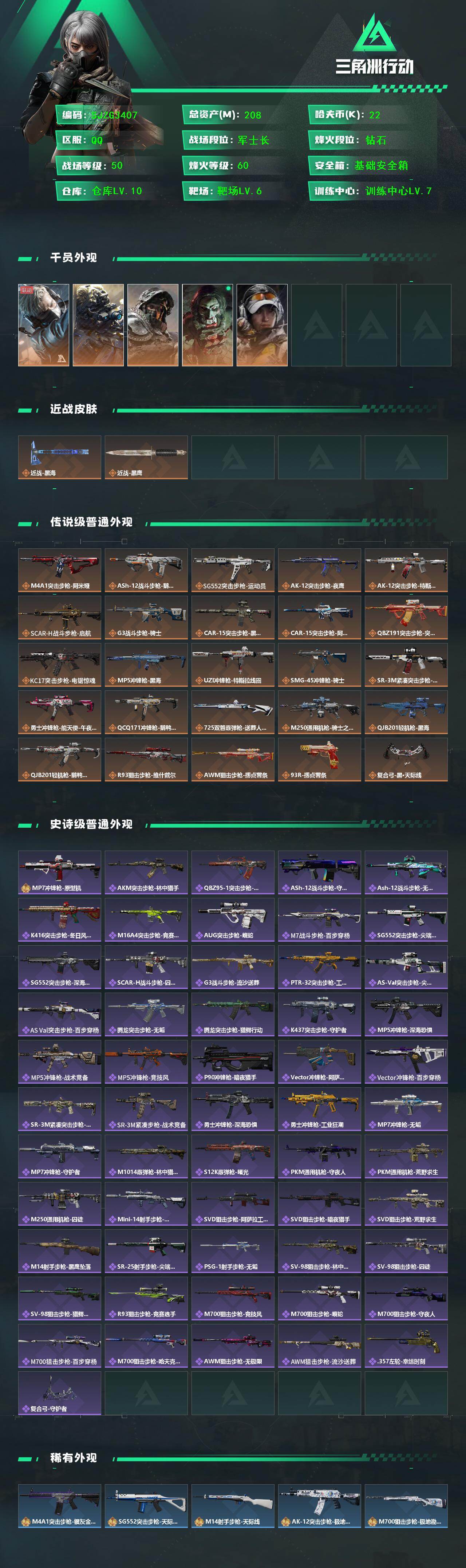 【SJZG3407】总资产(M):208M/哈夫币(K):22K/哈夫币(K):22K/传说枪皮数:25/全面战场等级:50_段位:军士长/烽火地带等级:60_段位:钻石/蜂医-送葬人·无题密令/无名-夜鹰/深蓝-不破誓约/红狼-电锯惊魂/露娜-金牌射手/近战-黑海/近战-黑鹰/M4A1突击步枪-阿米娅/ASh-12战斗步枪-鹅鸭杀/SG552突击步枪-运动员/AK-12突击步枪-夜鹰/AK-12突击步枪-特斯拉线圈/SCAR-H战斗步枪-启航/G3战斗步枪-骑士/CAR-15突击步枪-黑鹰坠落