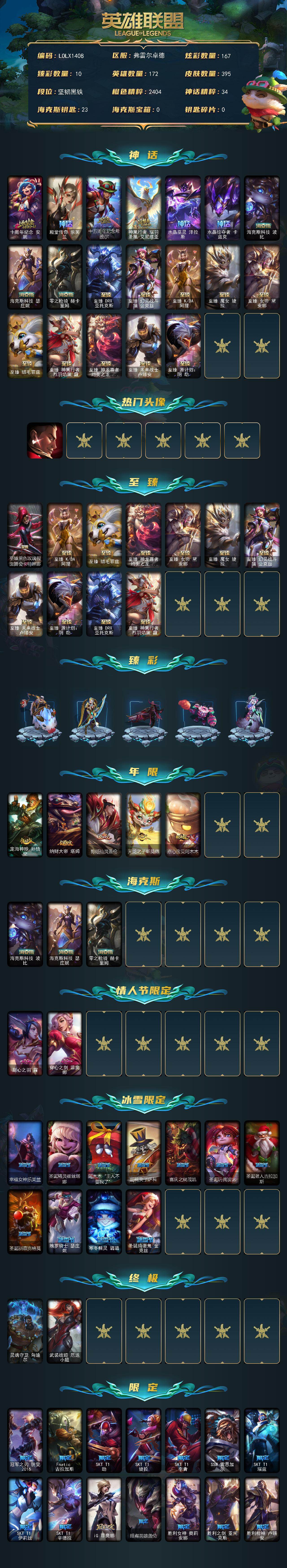 【LOLX1408】172英雄/395皮肤/2终极/20神话/48限定/10臻彩/167炫彩/46传说/75史诗/未定级/十周年纪念安妮/殿堂传奇乐芙兰/十五周年纪念希维尔/神凰行者瑞羽圣凰艾尼维亚/水晶巫灵泽拉斯/水晶掠夺者卡兹克/海克斯科技波比/海克斯科技瑟庄妮/零之枪骑赫卡里姆/至臻DRX亚托克斯/至臻幻灵战斗猫金克丝/至臻KDA阿狸/至臻魔女婕拉/至臻女帝黛安娜/至臻绒毛菲兹/至臻神凰行者烈羽焰凰霞/至臻神龙尊者均衡之龙沃利贝尔/至臻未来战士卢锡安/至臻源计划阴劫/觅心游侠卢锡安头像/至
