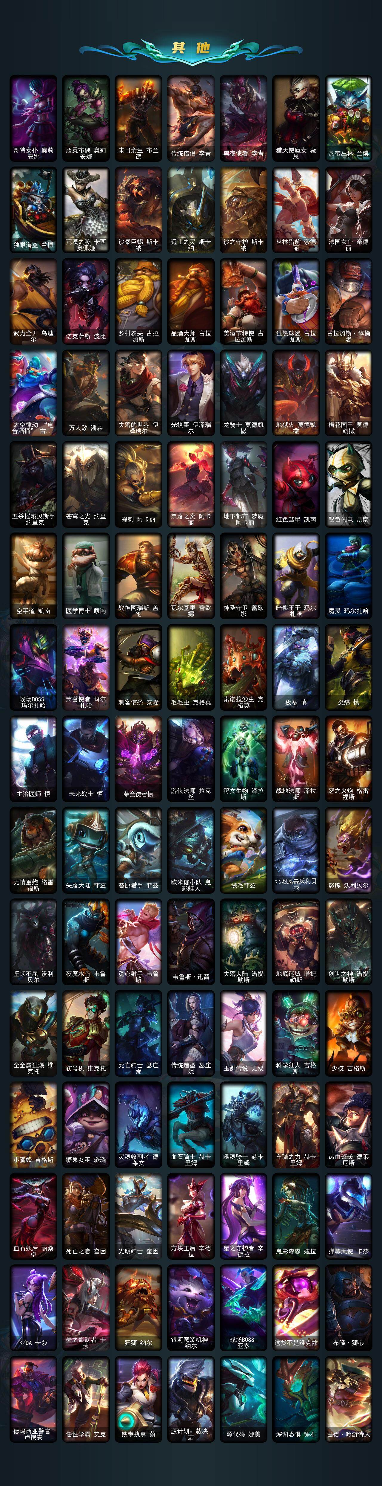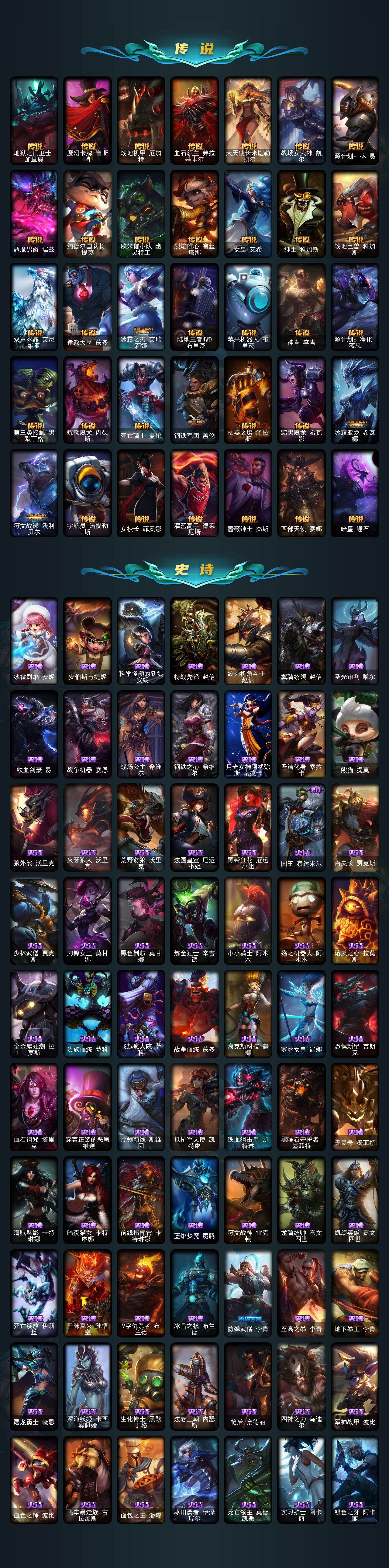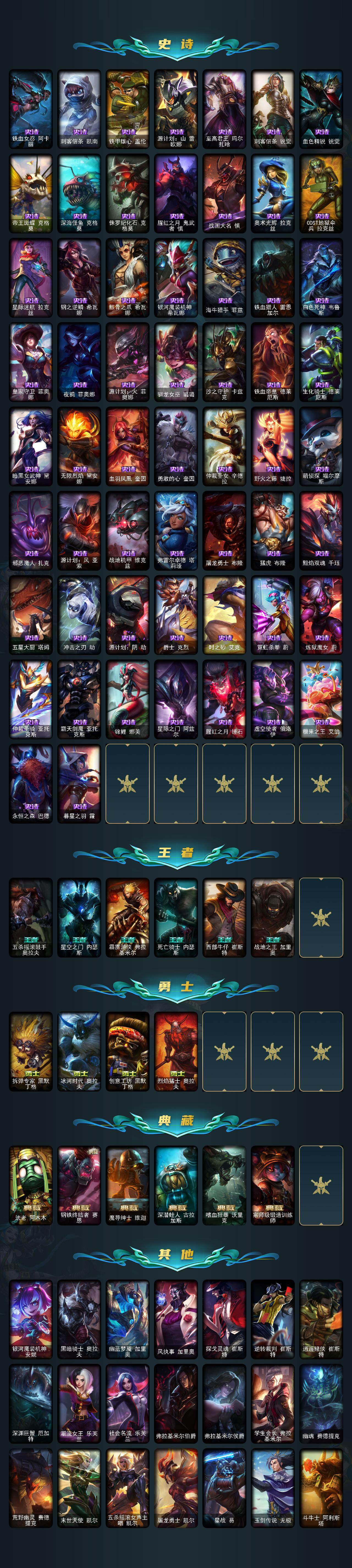 172英雄/485皮肤/1终极/2神话/71限定/5臻彩/20炫彩/35传说/128史诗
