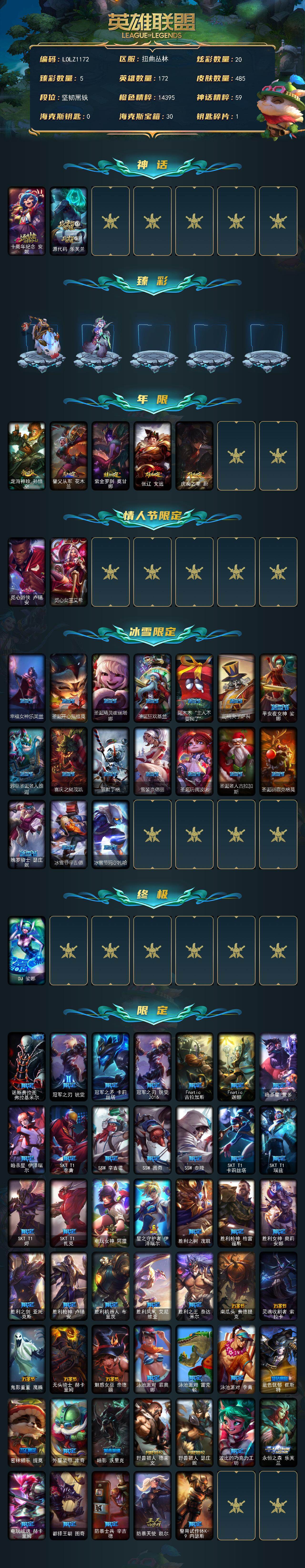 【LOLZ1172】172英雄/485皮肤/1终极/2神话/71限定/5臻彩/20炫彩/35传说/128史诗/未定级/十周年纪念安妮/源代码乐芙兰/天龙之子卡莎飞龙乘云/无畏骑士瑟庄妮赤子初心/墨之影武者亚索金墨耀影/魔女阿卡丽虚荣/净雪之月莫甘娜冬虹/定海神珍孙悟空/替父从军花木兰/紫金罗刹莫甘娜/张辽文远/虎痴之拳蔚/觅心游侠卢锡安/觅心女王艾希/幸福女神乐芙兰/圣诞开心鬼提莫/圣诞精灵崔丝塔娜/圣诞狂欢基兰/阿木木“主人不要我了”/胡桃夹子萨科/平安夜女神娑娜/邪恶圣诞老人维迦/喜庆之树茂