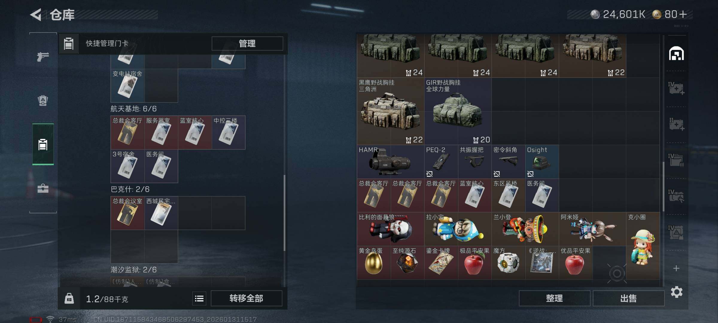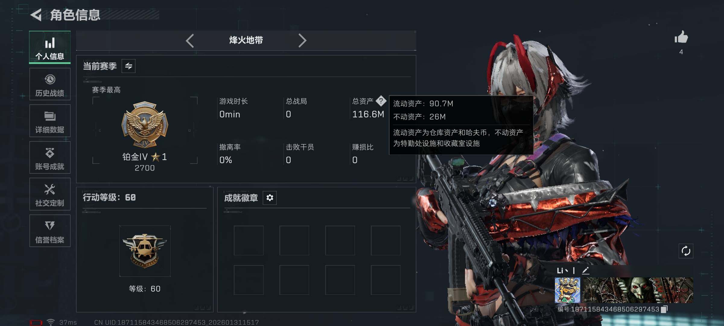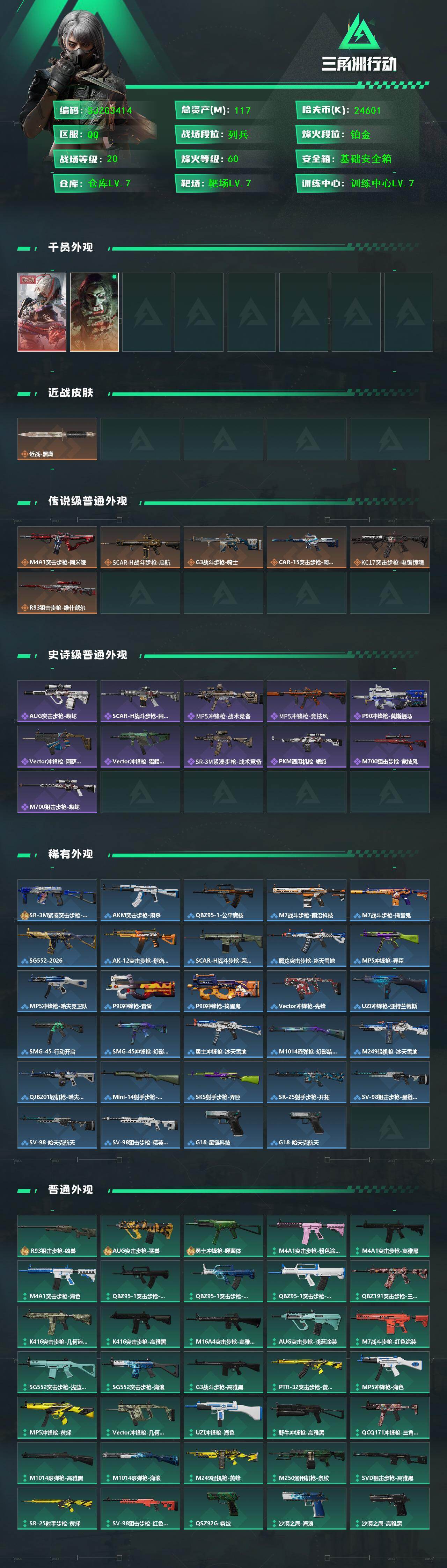 【SJZG3414】总资产(M):117M/哈夫币(K):24601K/哈夫币(K):24601K/传说枪皮数:6/全面战场等级:20_段位:列兵/烽火地带等级:60_段位:铂金/骇爪-维什戴尔/红狼-电锯惊魂/近战-黑鹰/M4A1突击步枪-阿米娅/SCAR-H战斗步枪-启航/G3战斗步枪-骑士/CAR-15突击步枪-阿米娅/KC17突击步枪-电锯惊魂/R93狙击步枪-维什戴尔/AUG突击步枪-蝮蛇/SCAR-H战斗步枪-囚徒/MP5冲锋枪-战术竞备/MP5冲锋枪-竞技风/P90冲锋枪-莫斯提马