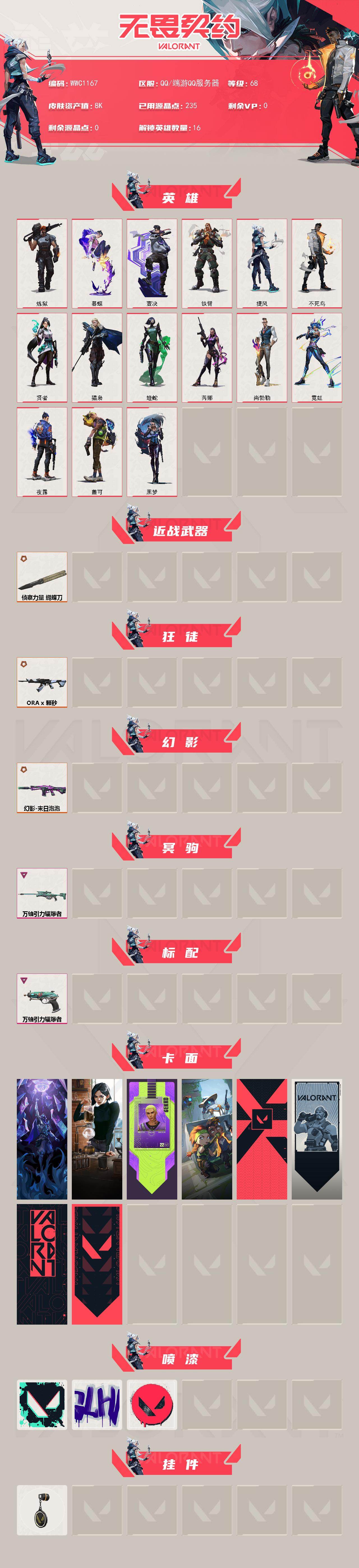 【WWC1167】终极*3/传奇*1/卓越*2/皮肤*17/等级*68/段位:青铜/炼狱/暮蝶/壹决/铁臂/捷风/不死鸟/贤者/猎枭/蝰蛇/芮娜/尚勃勒/霓虹/夜露/盖可/黑梦/近战武器-侦察力量 蝴蝶刀/狂徒-ORA x 颗秒/幻影-末日泡泡/冥驹-万铀引力辐爆者/标配-万铀引力辐爆者/失而复得 卡面/虹吸式咖啡壶 卡面/盖可工牌 卡面/别冒尖 卡面/代号红色 卡面/新兵报到 卡面/V契约 卡面/无畏契约 卡面/胜利属于无畏契约 喷漆/GLHF 喷漆/无畏契约 喷漆/无畏契约 纪念币 挂饰