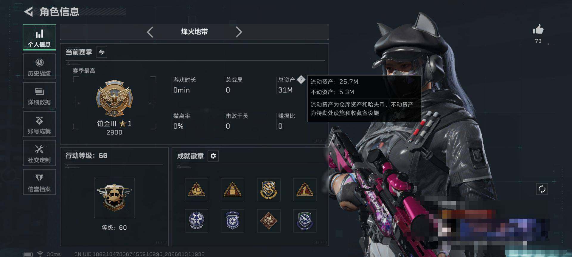 【SJ7396】总资产(M):31M/哈夫币(K):1647K/哈夫币(K):1647K/传说枪皮数:22/全面战场等级:26_段位:列兵/烽火地带等级:60_段位:铂金/露娜-黑·天际线/蜂医-送葬人·无题密令/无名-夜鹰/深蓝-不破誓约/红狼-电锯惊魂/露娜-金牌射手/近战-黑鹰/M4A1突击步枪-阿米娅/M16A4突击步枪-狩猎时刻/M7战斗步枪-巳蛇/SG552突击步枪-运动员/AK-12突击步枪-夜鹰/AK-12突击步枪-特斯拉线圈/SCAR-H战斗步枪-水墨云图/SCAR-H战斗步枪