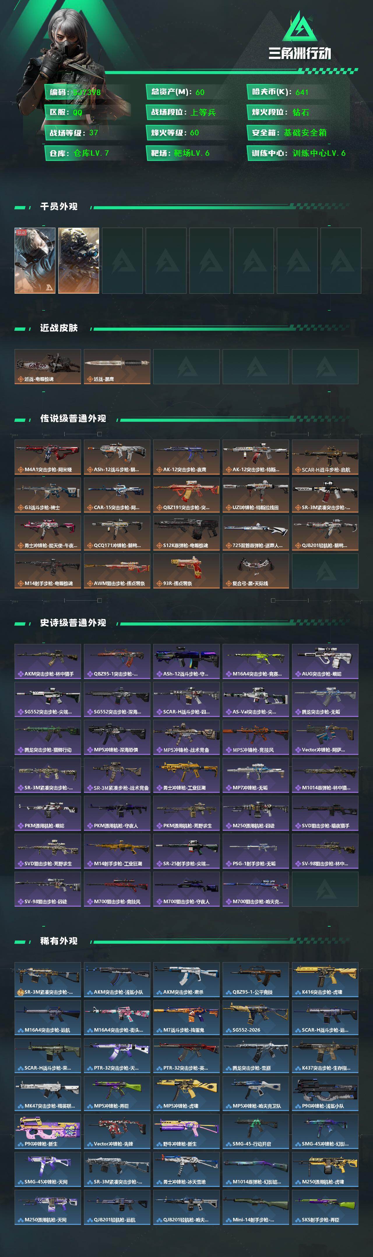【SJ7398】总资产(M):60M/哈夫币(K):641K/哈夫币(K):641K/传说枪皮数:19/全面战场等级:37_段位:上等兵/烽火地带等级:60_段位:钻石/蜂医-送葬人·无题密令/无名-夜鹰/近战-电锯惊魂/近战-黑鹰/M4A1突击步枪-阿米娅/ASh-12战斗步枪-鹅鸭杀/AK-12突击步枪-夜鹰/AK-12突击步枪-特斯拉线圈/SCAR-H战斗步枪-启航/G3战斗步枪-骑士/CAR-15突击步枪-阿米娅/腾龙突击步枪-捞点薯条/UZI冲锋枪-特斯拉线圈/SR-3M紧凑突击步枪-