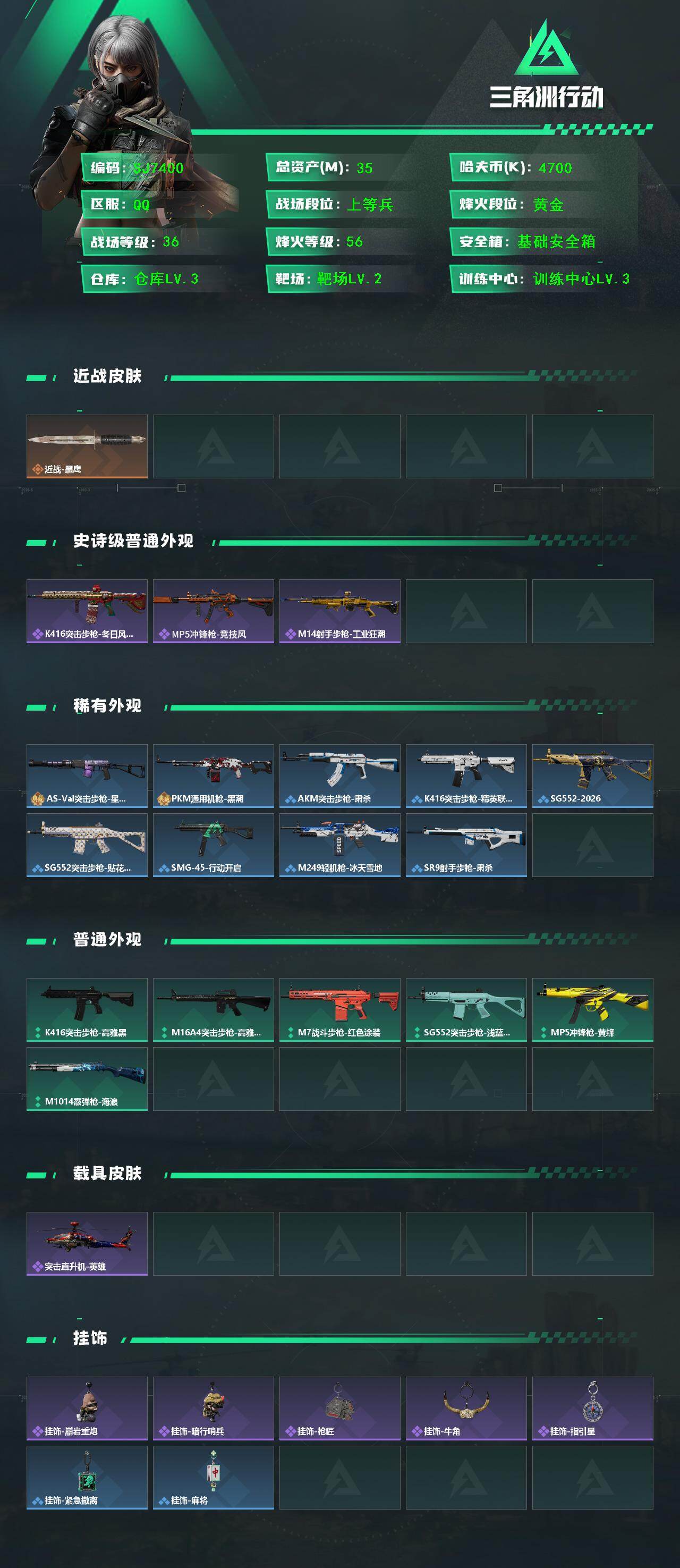 【SJ7400】总资产(M):35M/哈夫币(K):4700K/哈夫币(K):4700K/全面战场等级:36_段位:上等兵/烽火地带等级:56_段位:黄金/近战-黑鹰/K416突击步枪-冬日风情/MP5冲锋枪-竞技风/M14射手步枪-工业狂潮/As Val突击步枪-星之彩/PKM通用机枪-黑潮/AKM突击步枪-肃杀/K416突击步枪-精英联盟/SG552突击步枪-2026/SG552突击步枪-贴花艺术/SMG-45-行动开启/M249轻机枪-冰天雪地/SR9射手步枪-肃杀/K416突击步枪-高雅