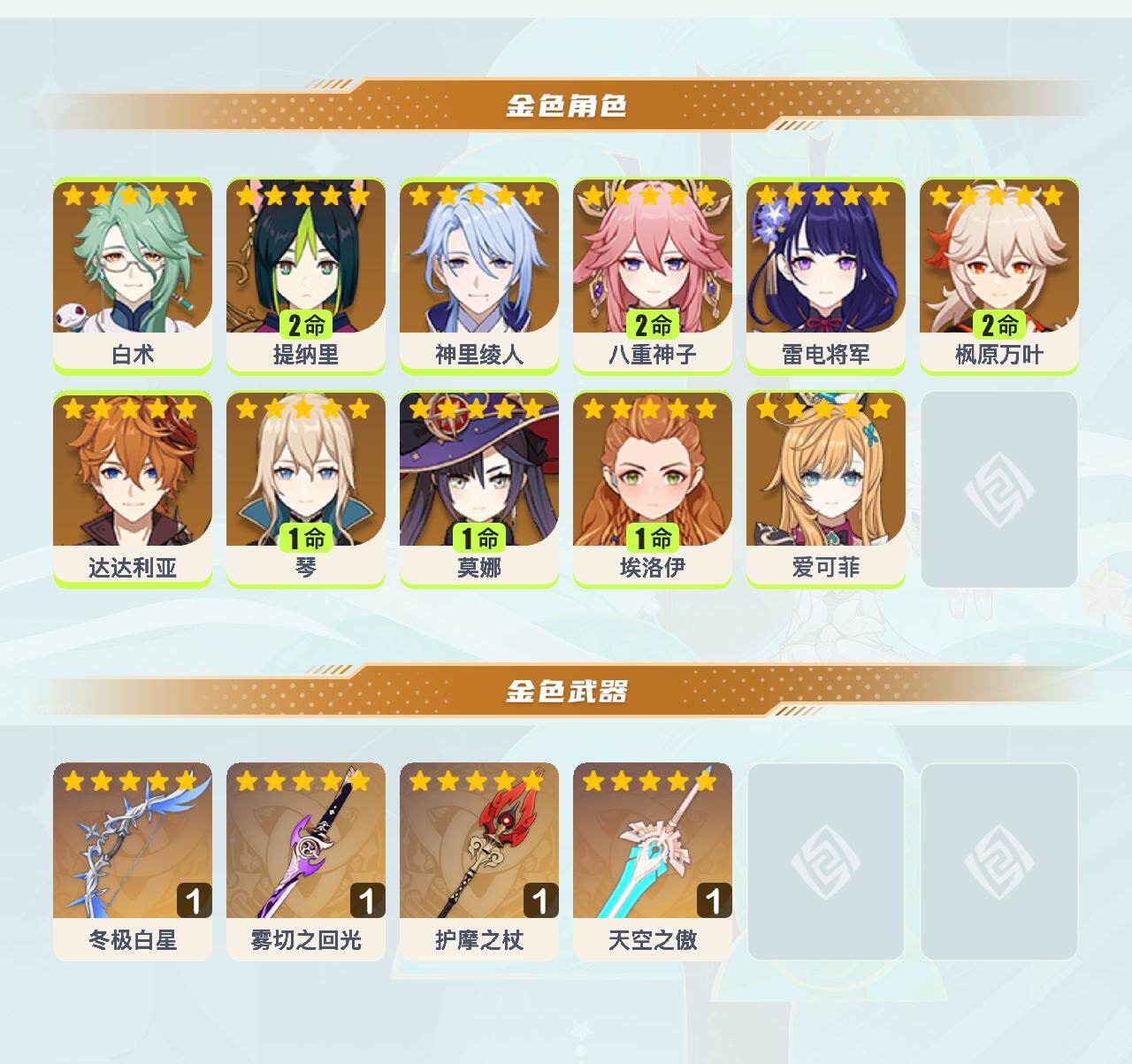 【YSN2311】56级/24黄/女主/11个五星角色/5个五星武器/2命枫原万叶/达达利亚/2命提纳里/神里绫人/2命八重神子/雷电将军/白术/1命莫娜/1命琴/0命埃洛伊/0命爱可菲/冬极白星/护摩之杖/雾切之回光/天空之傲