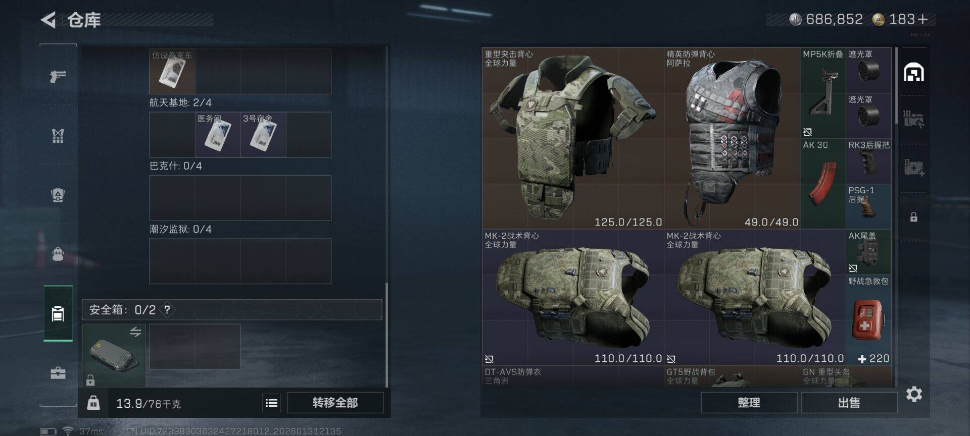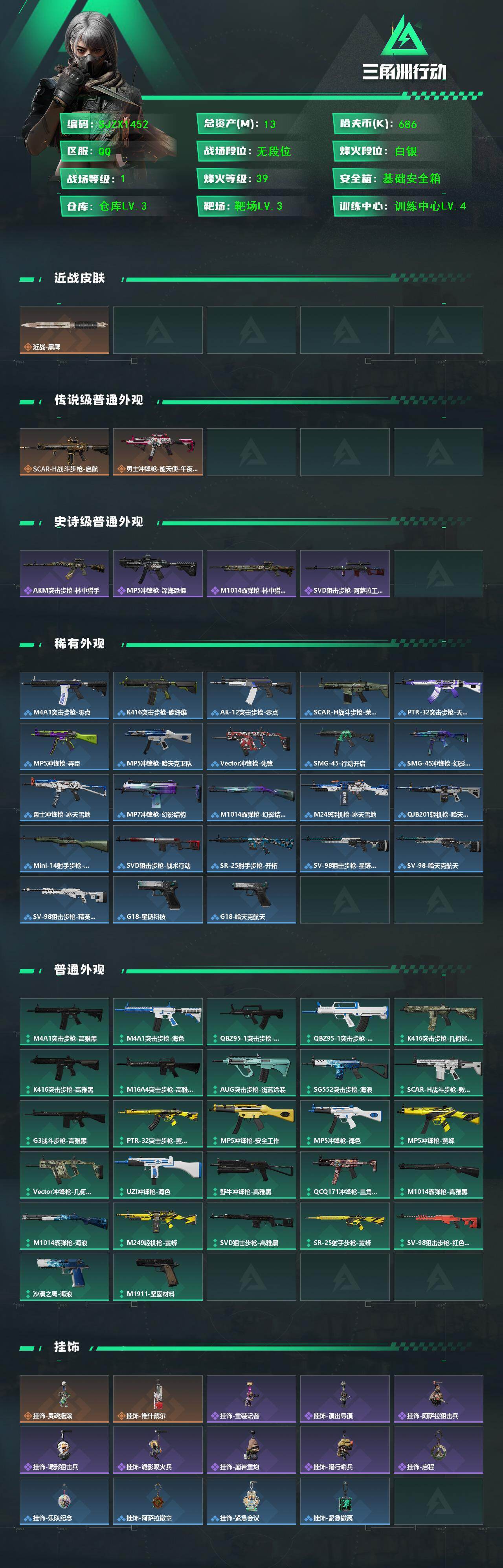 【SJZX1452】总资产(M):13M/哈夫币(K):686K/哈夫币(K):686K/传说枪皮数:2/全面战场等级:1_段位:无段位/烽火地带等级:39_段位:白银/近战-黑鹰/SCAR-H战斗步枪-启航/勇士冲锋枪-能天使-午夜邮差/AKM突击步枪-林中猎手/MP5冲锋枪-深海恐惧/M1014霰弹枪-林中猎手/SVD狙击步枪-阿萨拉工艺/M4A1突击步枪-零点/K416突击步枪-碳纤维/AK-12突击步枪-零点/SCAR-H战斗步枪-荣耀列队/PTR-32突击步枪-天网/MP5冲锋枪-弄臣