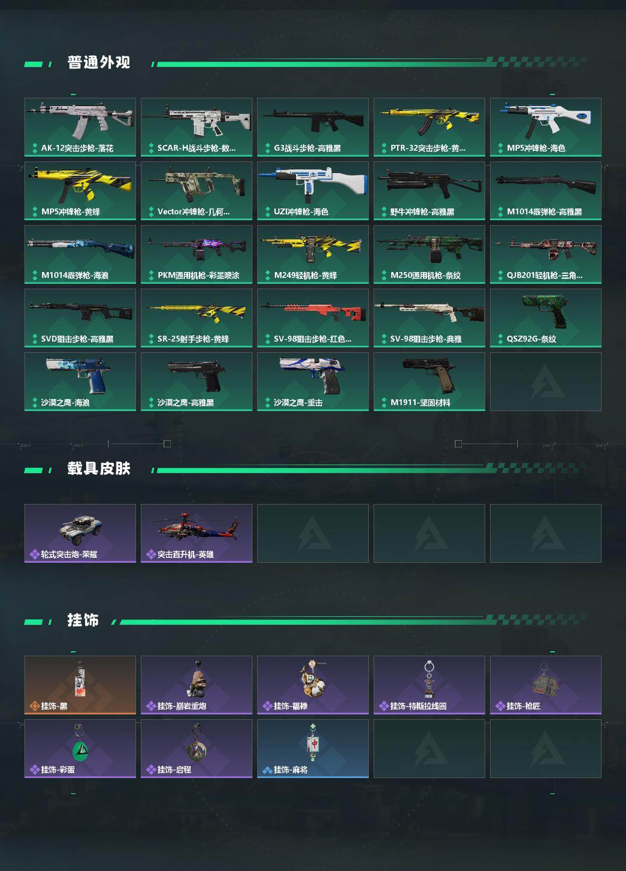 【传说外观】:M4A1突击步枪-蚀金玫瑰,M4A1突击步枪-阿米娅,AK-12突击步枪-特斯拉线圈,SCAR-H战斗步枪-启航,G3战斗步枪-骑士,KC17突击步枪-电锯惊魂,UZI冲锋枪-特斯拉线圈,SR-3M紧凑突击步枪-特斯拉线圈,