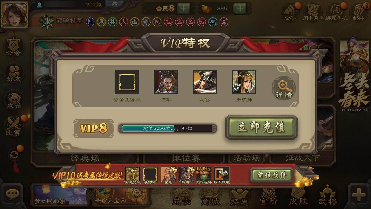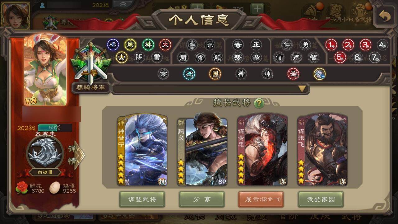 官阶:骠骑将军;VIP等级:VIP8;史诗武将数量:18;动态皮肤数量:14;
