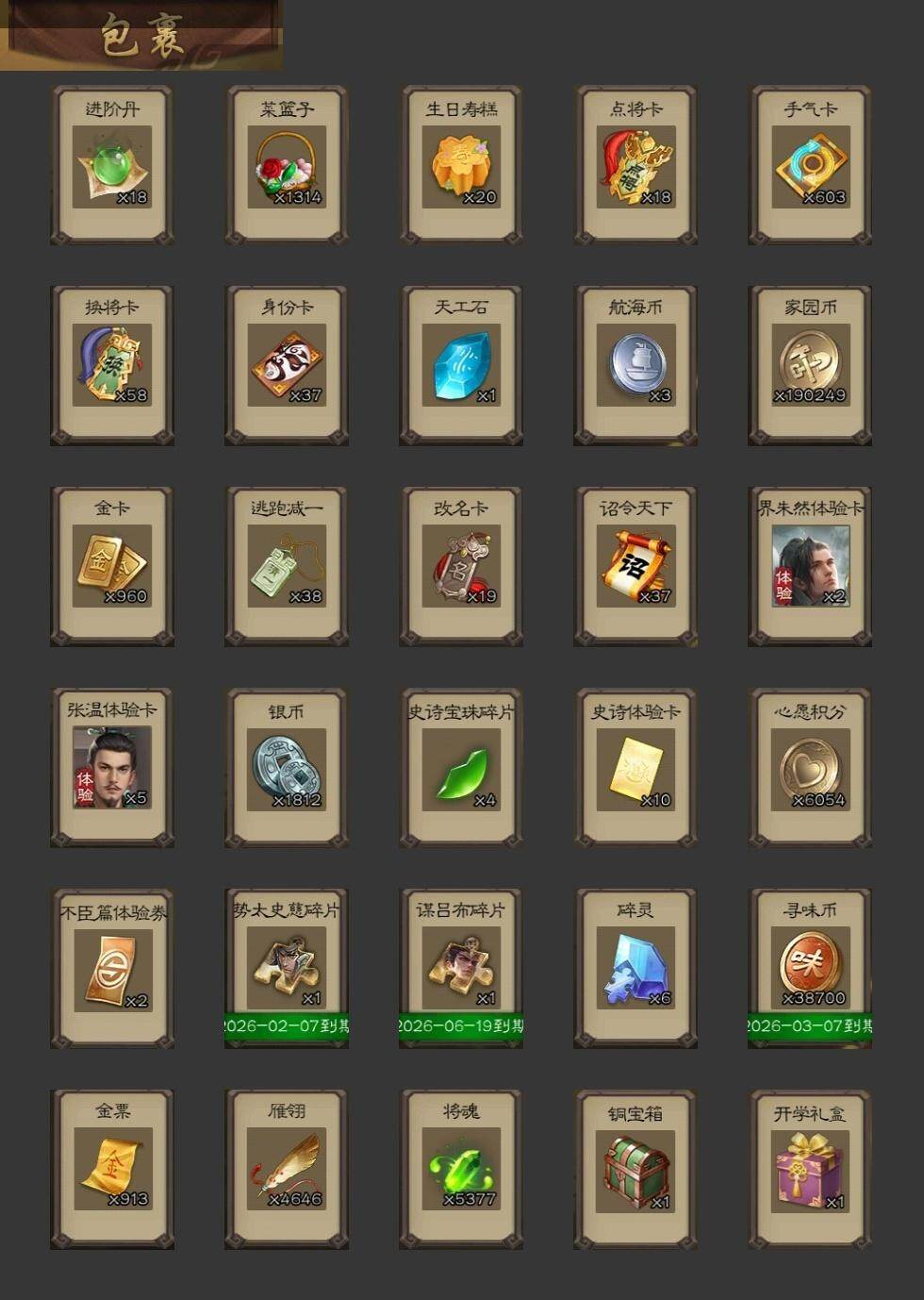 官阶:骠骑将军;VIP等级:VIP8;史诗武将数量:18;动态皮肤数量:14;武将总数:280;史诗宝珠数量:0;将魂数量:5377;神将:2;魏国史诗武将:2;蜀国史诗武将:6;吴国史诗武将:2;群史诗武将:6
