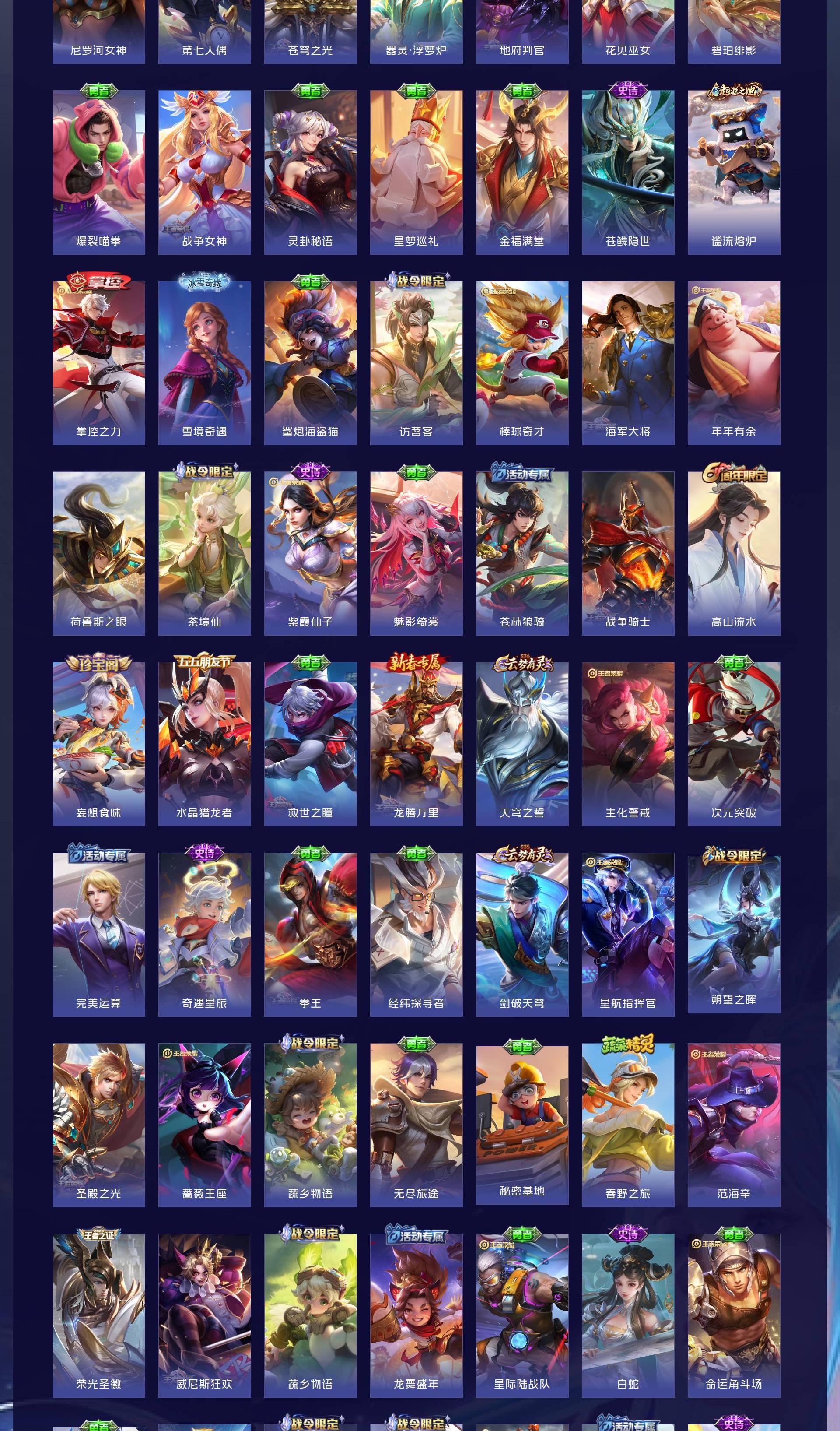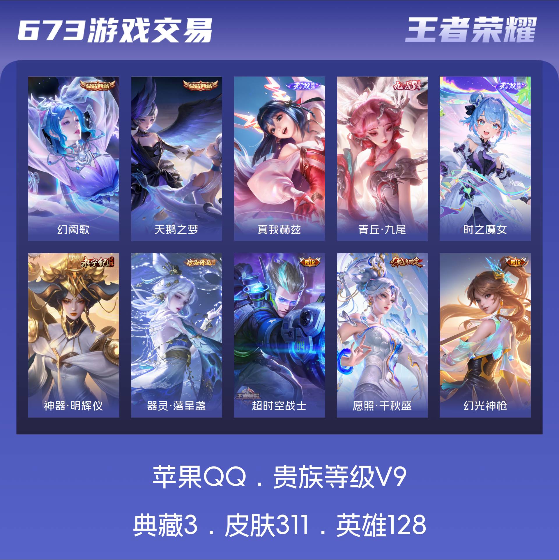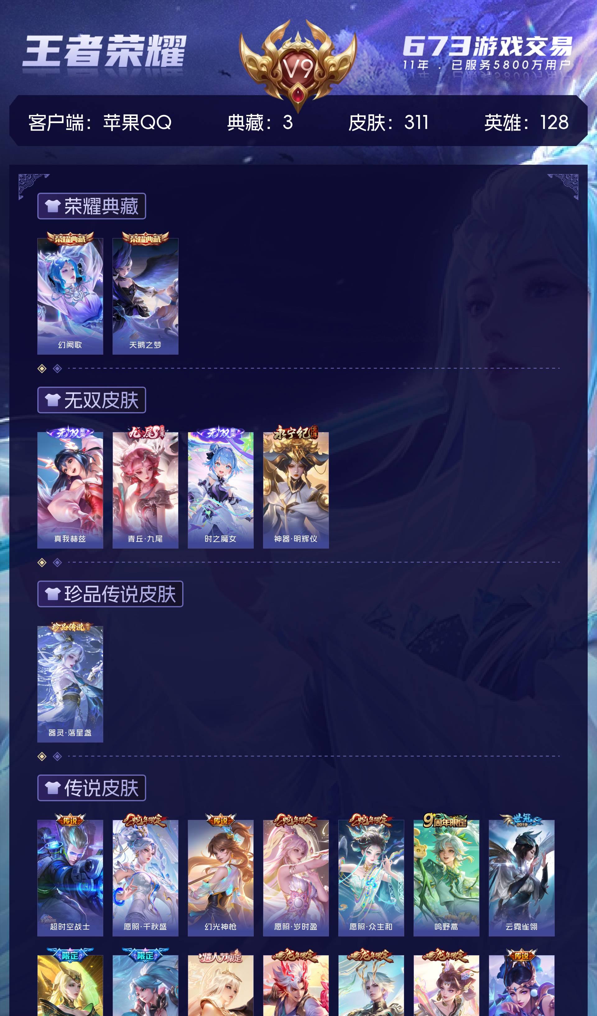 V9 皮肤311 英雄128 尊贵铂金 荣耀典藏3 无双皮肤4 珍品传说1 传说38 其他皮肤272